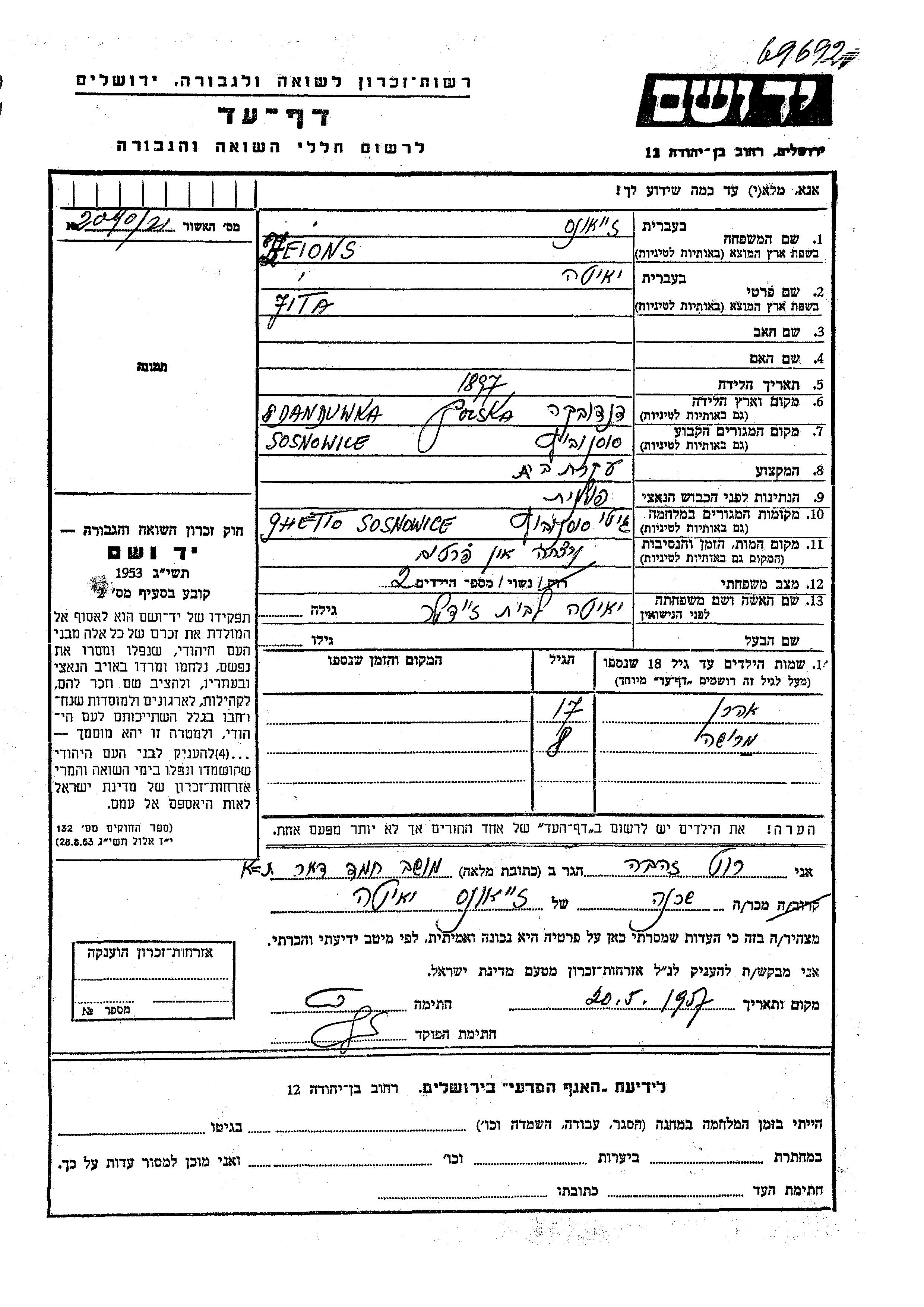 Jita Zeions nee Zeidler was born in Dandowka, Poland, 1897. She was a housewife and married. Prior to WWII she lived in Sosnowice, Poland. During the war she was in Sosnowiec, Poland. Jita was murdered in the Shoah.