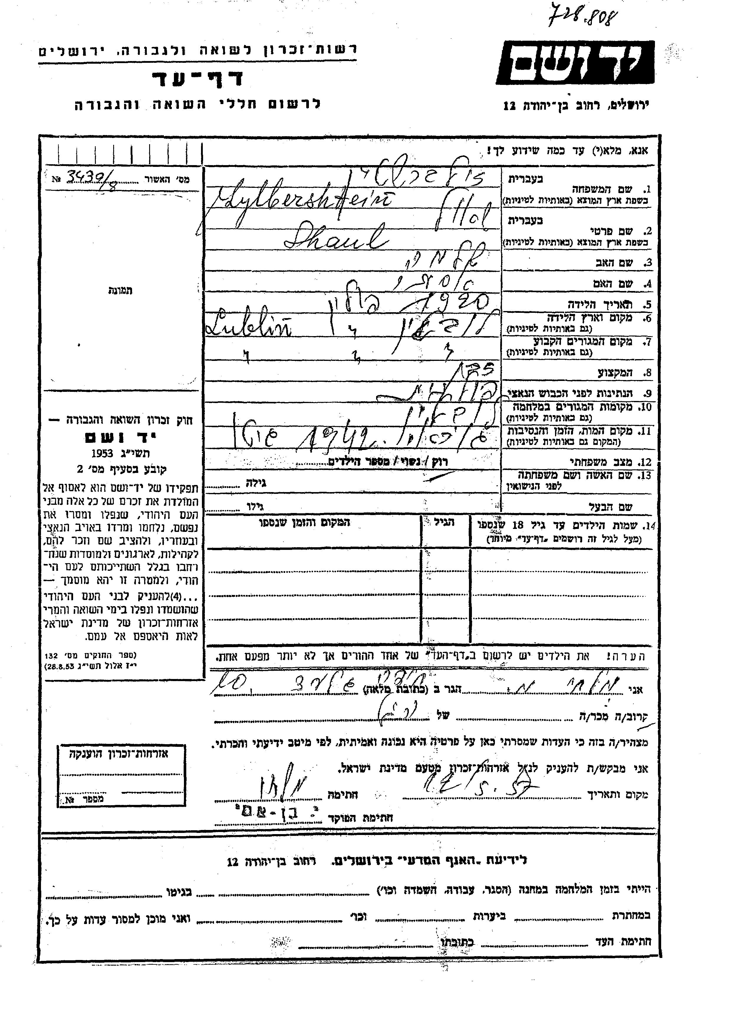 Zylbershtein Shaul 1920 Lublin, Poland Page of Testimony