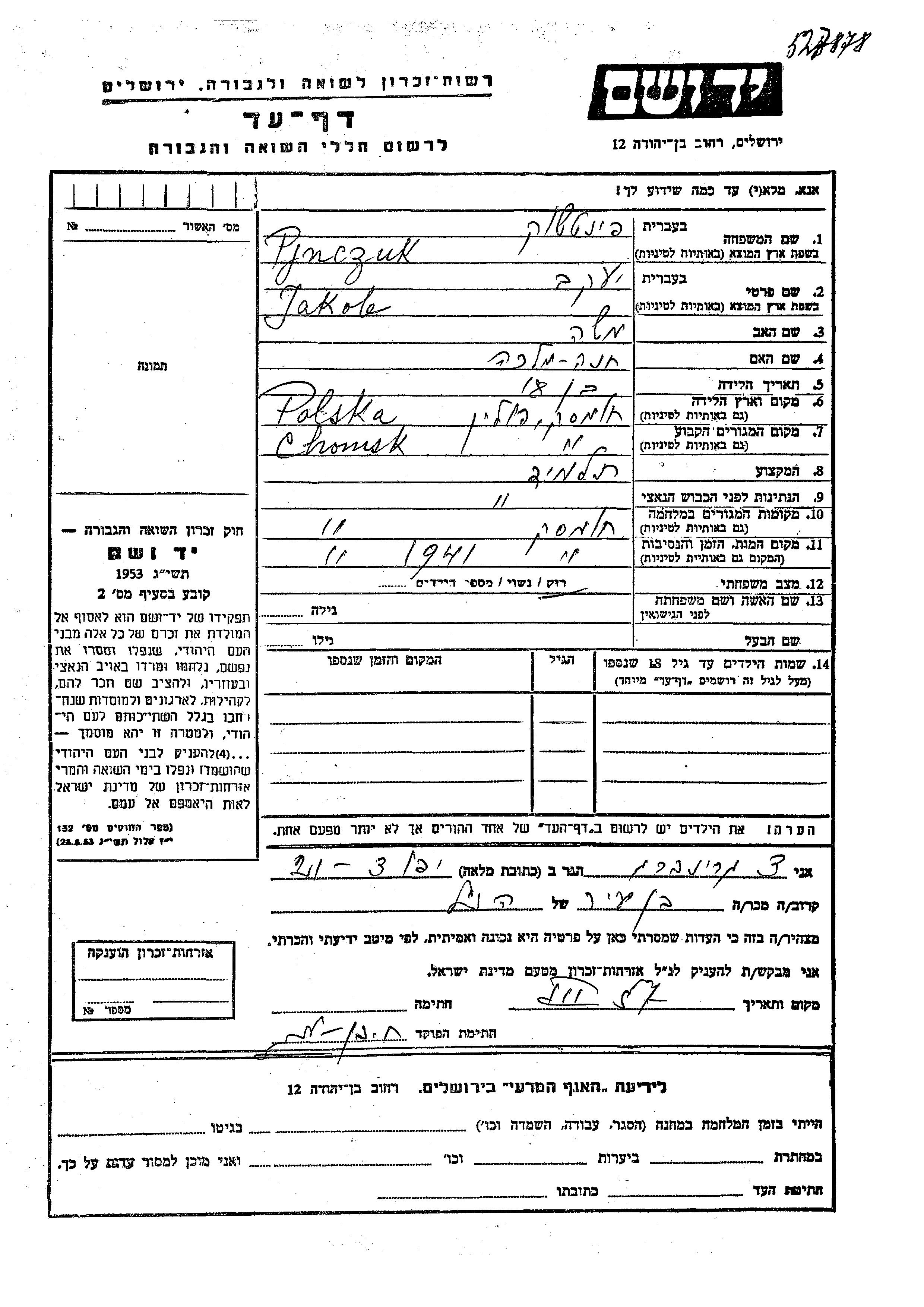 Jakov Pjnczuk was born in Poland to Moshe and Khana Malka. He was a pupil and single. Prior to WWII he lived in Chomsk, Poland. During the war he was in Chomsk, Poland. Jakov was murdered in the Shoah. Place of death: Chomsk, Poland, 1941.