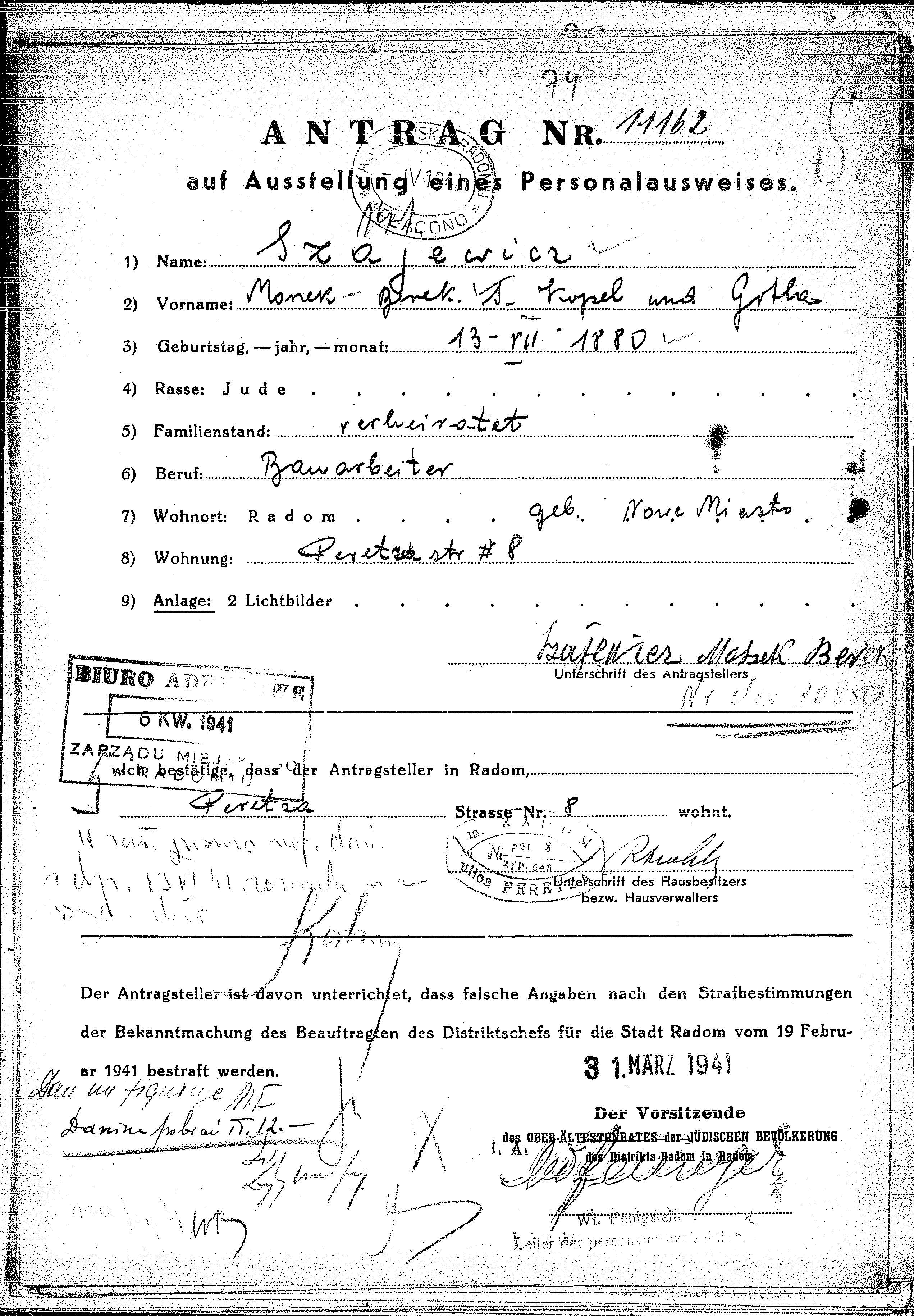 Moszek Berek Szajewicz was born in Nowe Miasto nad Pilica, Poland, 1880 to Kopel and Gitla. He was a bauarbeiter and married. Prior to WWII he lived in Radom, Poland. During the war he was in Radom, Poland. Moszek Berek Probably murdered the Shoah.
