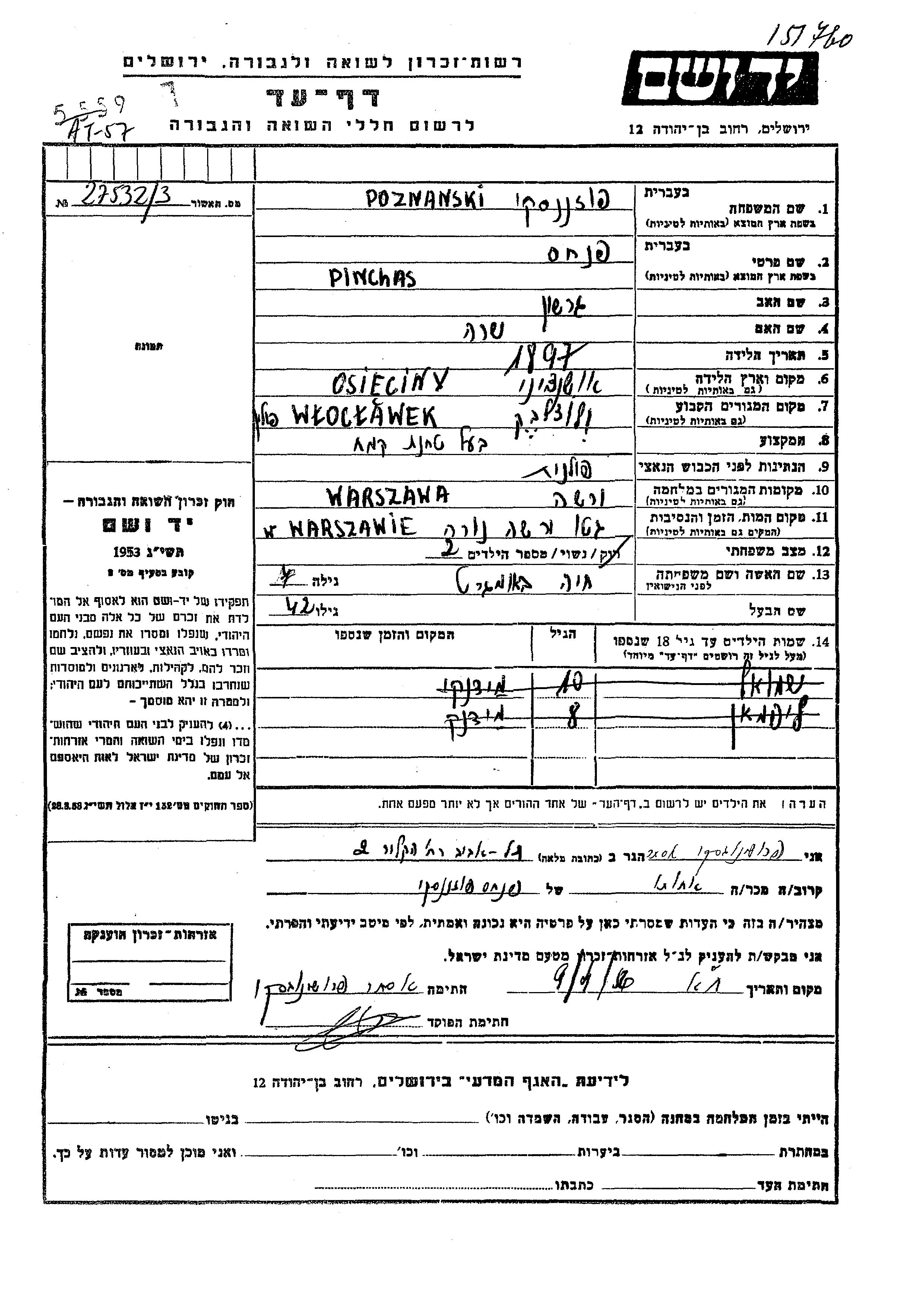 Pinchas Poznanski was born in Osieciny, Poland, 1897 to Gershon and Sara. He was a flourmill owner and married to Khaia nee Baumgart. Prior to WWII he lived in Wloclawek, Poland. During the war he was in Warszawa, Poland. Pinchas was murdered in the Shoah. Place of death: Warsaw, Poland.