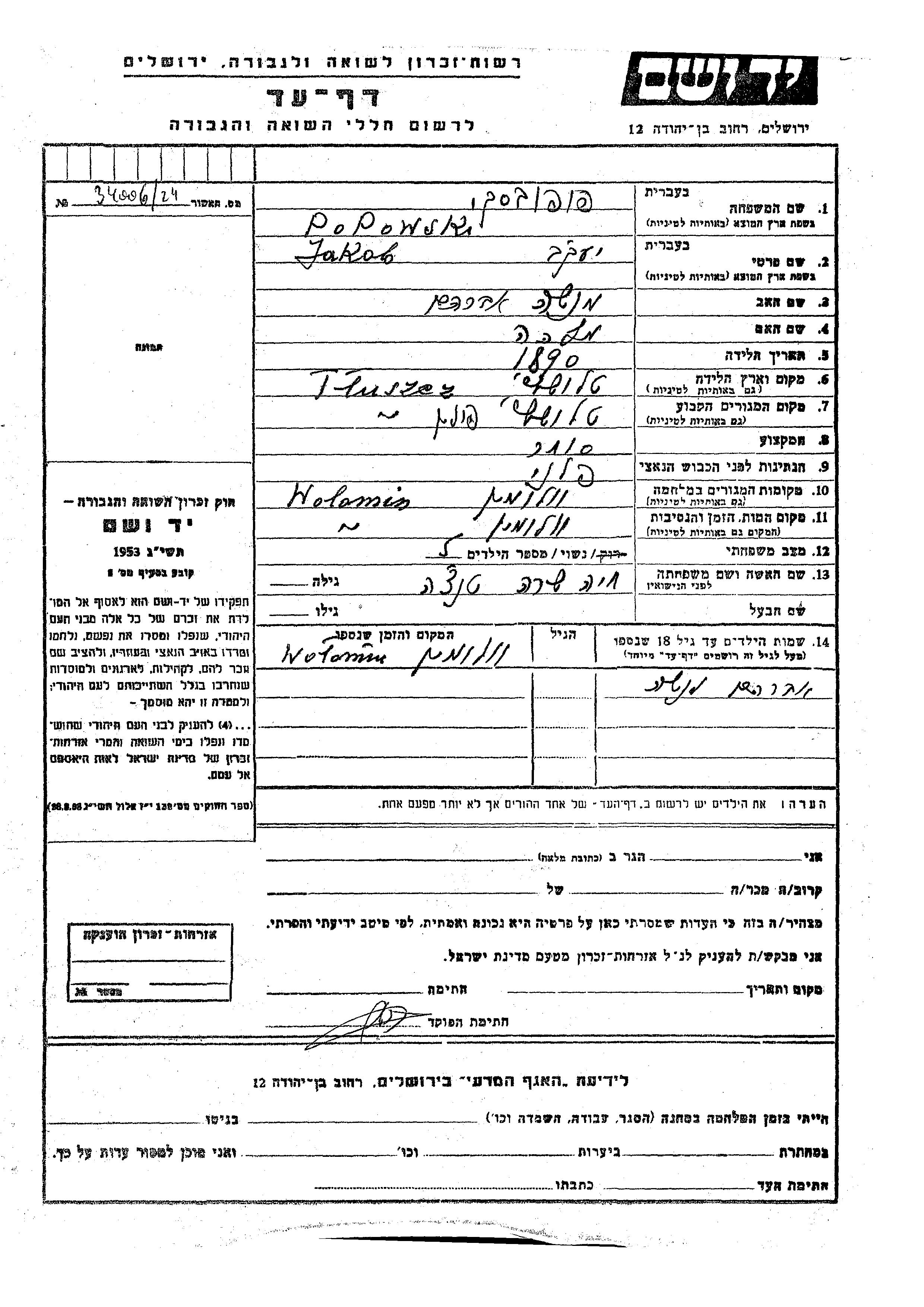 Jakob Popowski was born in Tluszcz, Poland, 1890 to Menashe Avraham and Malka. He was a merchant and married to Khaia Sara nee Tencha. Prior to WWII he lived in Tluszcz, Poland. During the war he was in Wolomin, Poland. Jakob was murdered in the Shoah. Place of death: Wolomin, Poland.