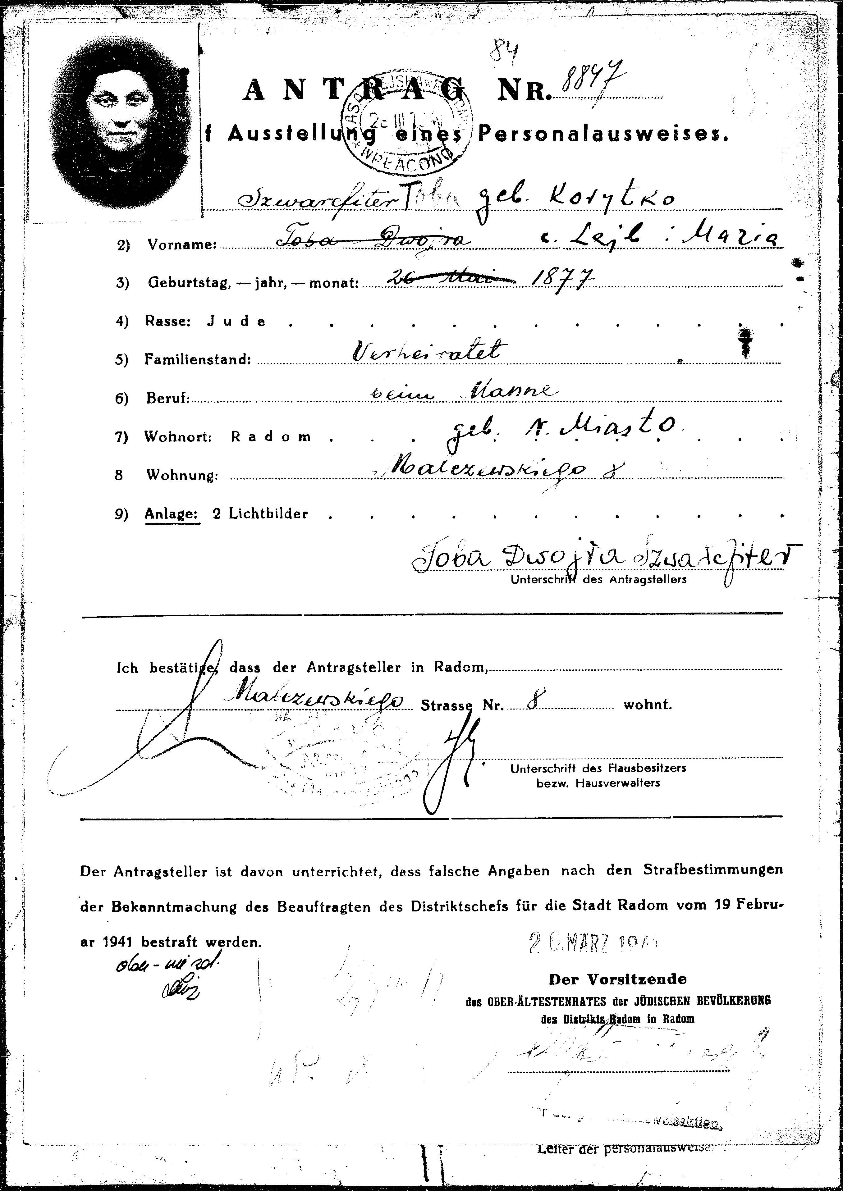 Toba Szwarcfiter nee Korytko was born in Nowe Miasto nad Pilica, Poland, 1877 to Lejb and Maria. She was a housewife and married. Prior to WWII she lived in Radom, Poland. During the war she was in Radom, Poland. Toba Probably murdered the Shoah.