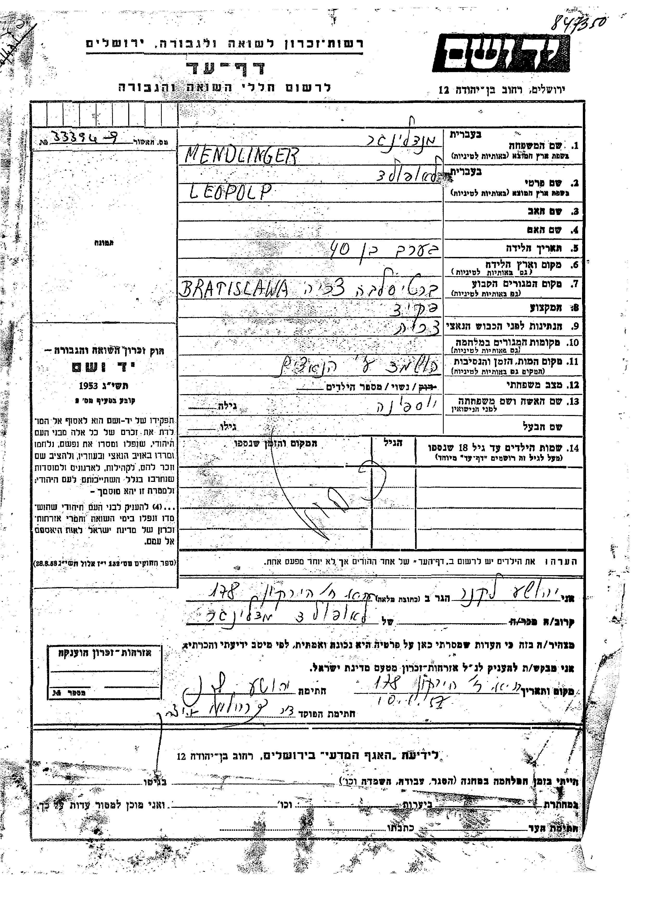Mendlinger Leopold Bratislava, Czechoslovakia Page of Testimony