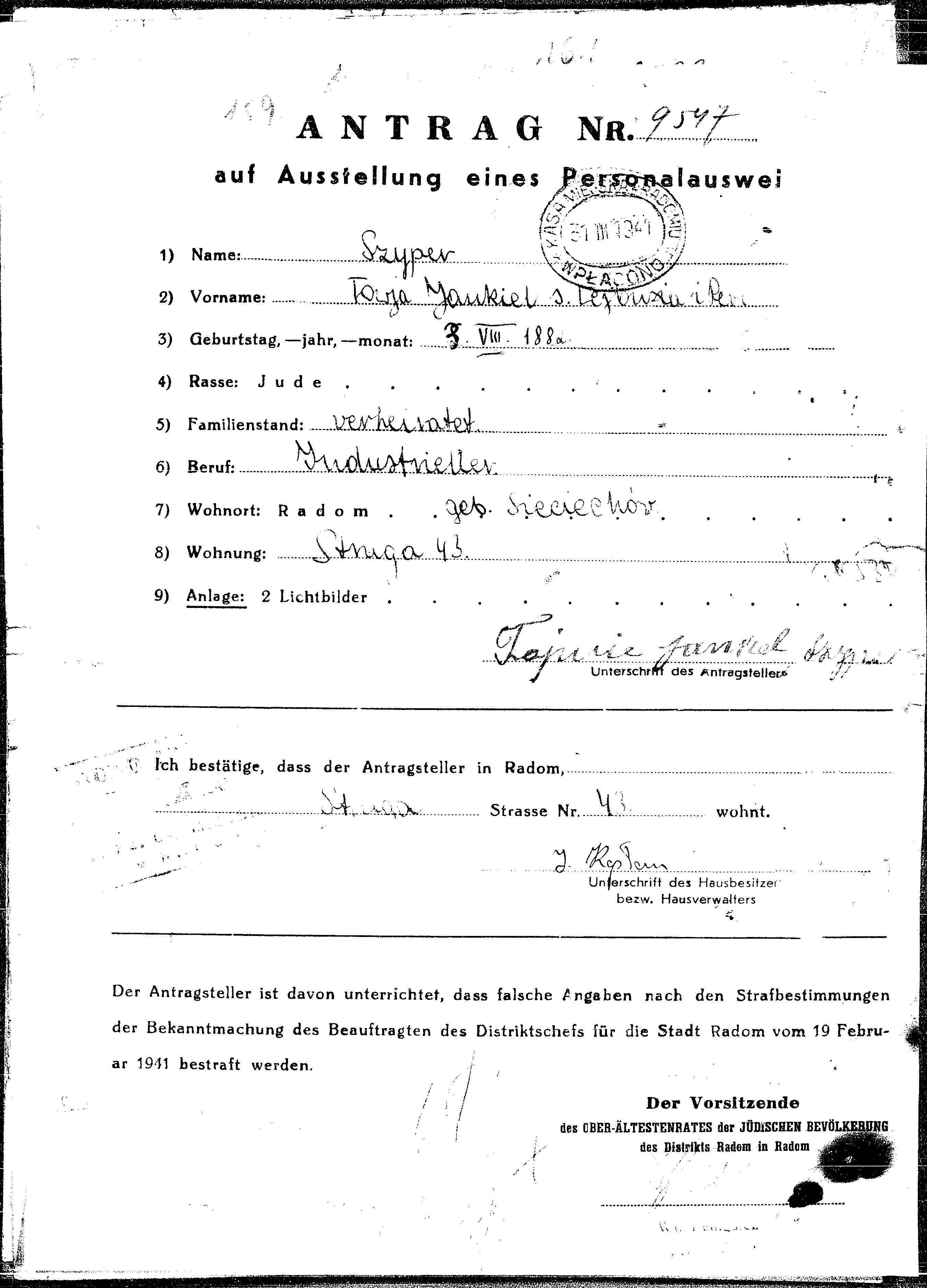 Towja Jankiel Szyper was born in Sieciechow, Poland, 1882 to Lejbus and Perla. He was an industrieller and married. Prior to WWII he lived in Radom, Poland. During the war he was in Radom, Poland. Towja Jankiel Probably murdered the Shoah.