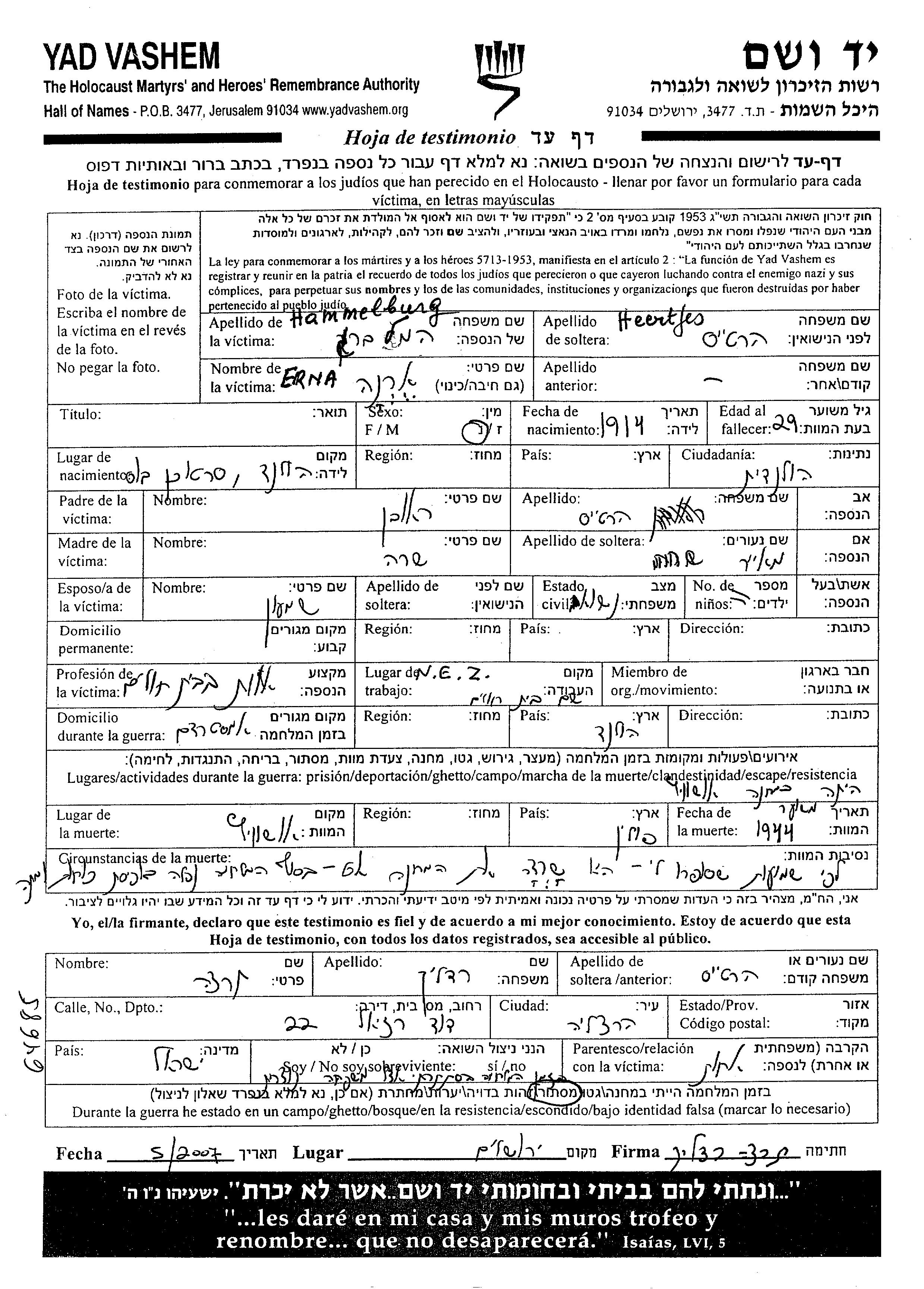 Hammelburg Erna 1914 unstated place, Page of Testimony