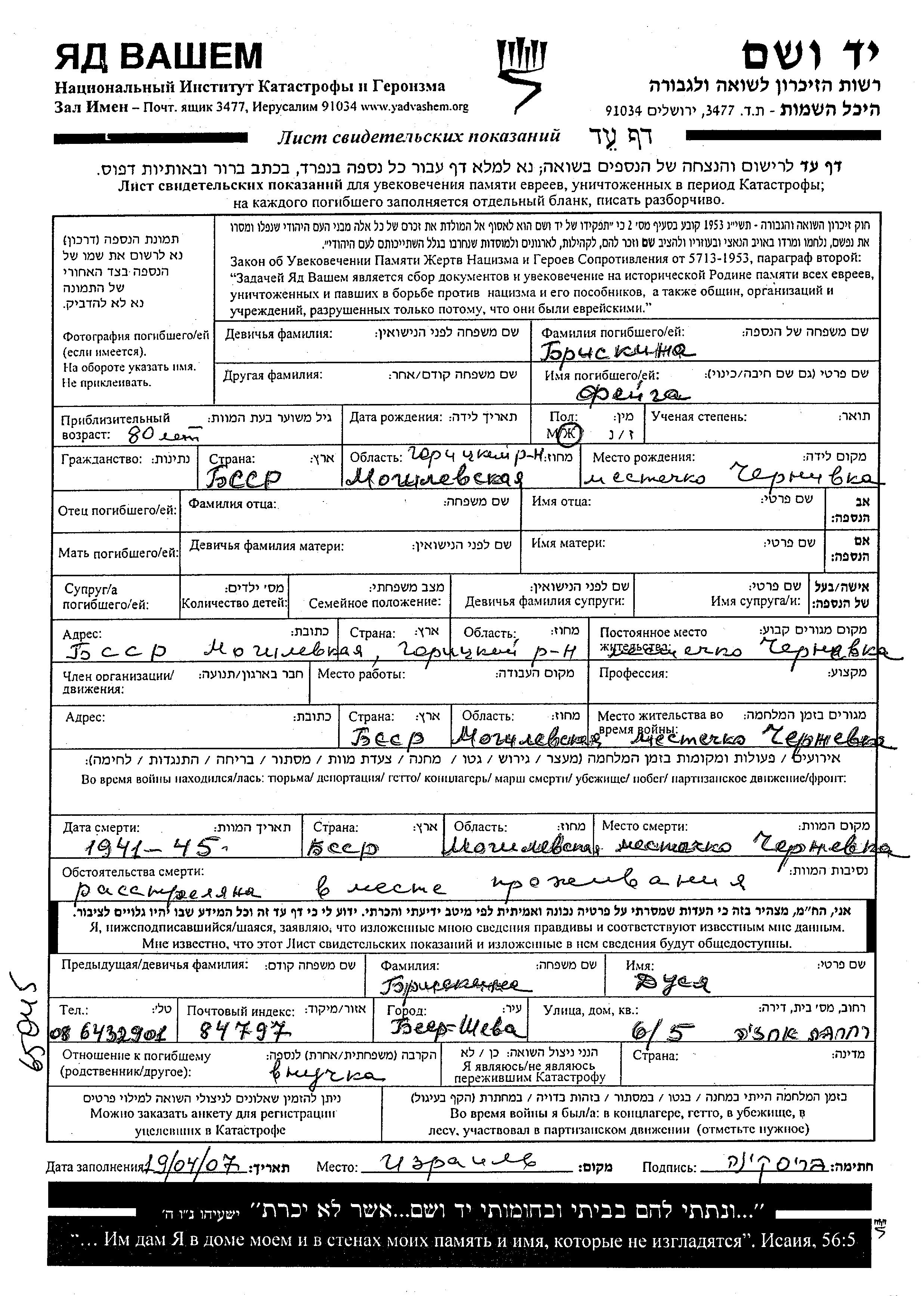Feiga Briskina was born in Chernevka, Belorussia (USSR). Prior to WWII she lived in Chernevka, Belorussia (USSR). During the war she was in Chernevka, Belorussia (USSR). Feiga was murdered in the Shoah. Place of death: Chernevka, Belorussia (USSR).