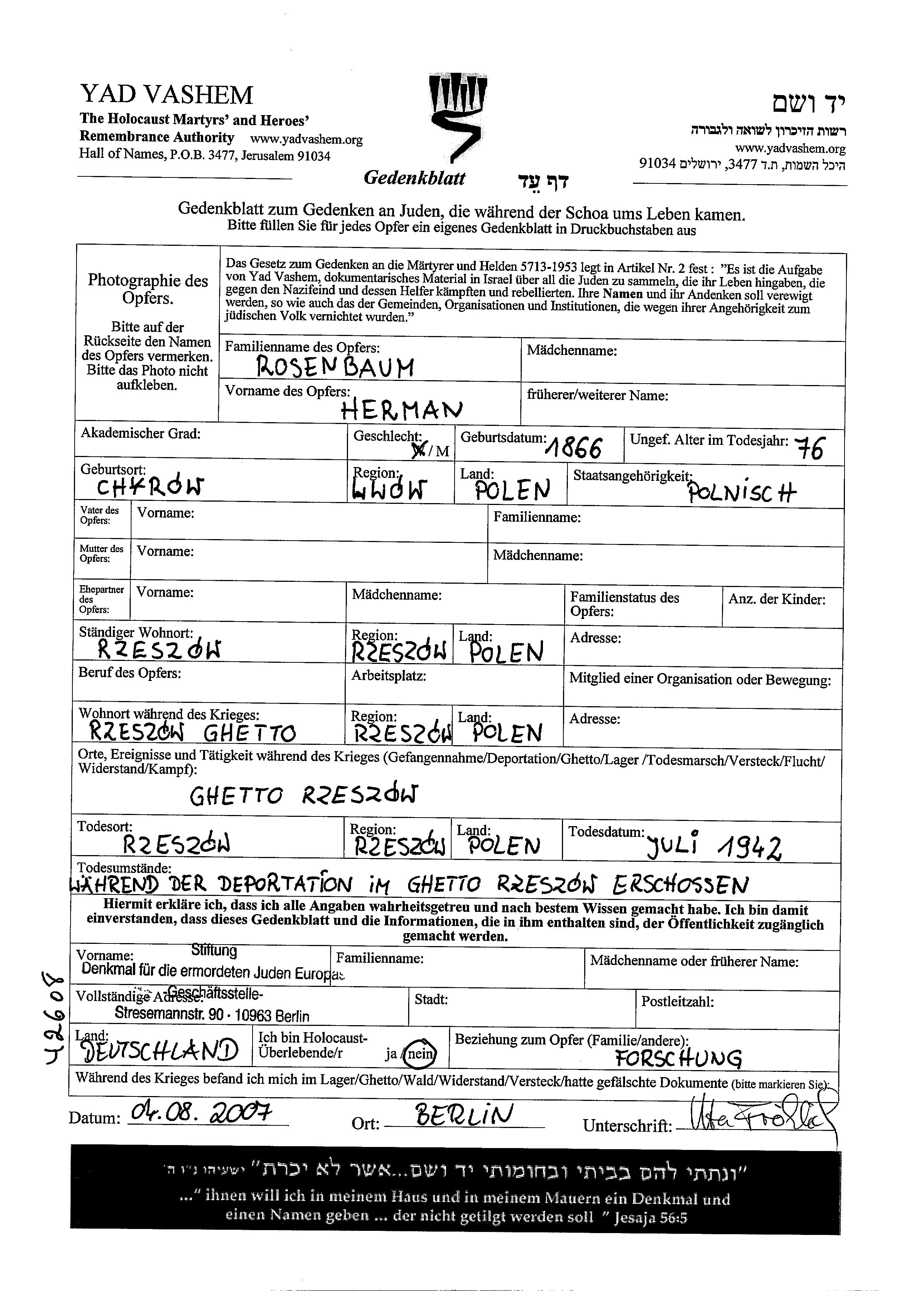 Herman Rosenbaum was born in Chyrów, Poland, 1866. Prior to WWII he lived in Rzeszow, Poland. During the war he was in Rzeszow, Poland. Herman was murdered in the Shoah. Place of death: Rzeszow, Poland, 07/1942.