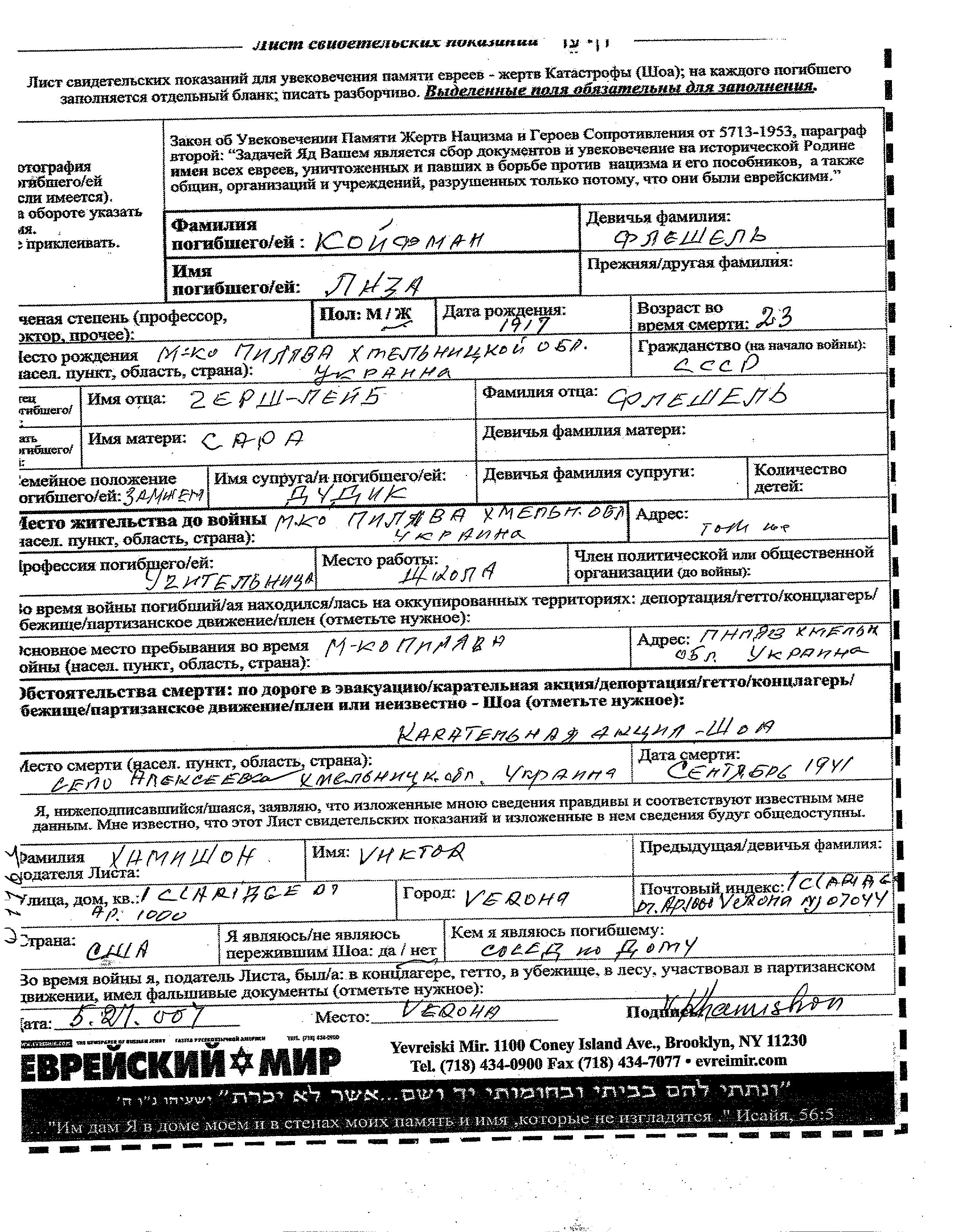 Koifman Liza 1917 Pilyava, Ukraine (USSR) Page of Testimony