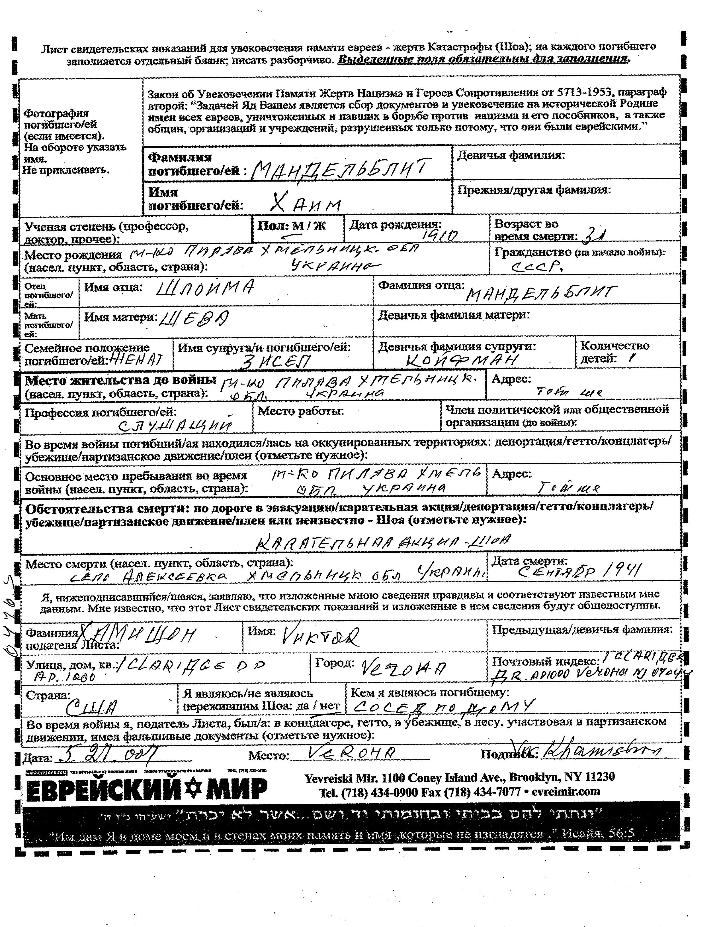 Mandelblit Khaim 1910 Pilyava, Ukraine (USSR) Page of Testimony