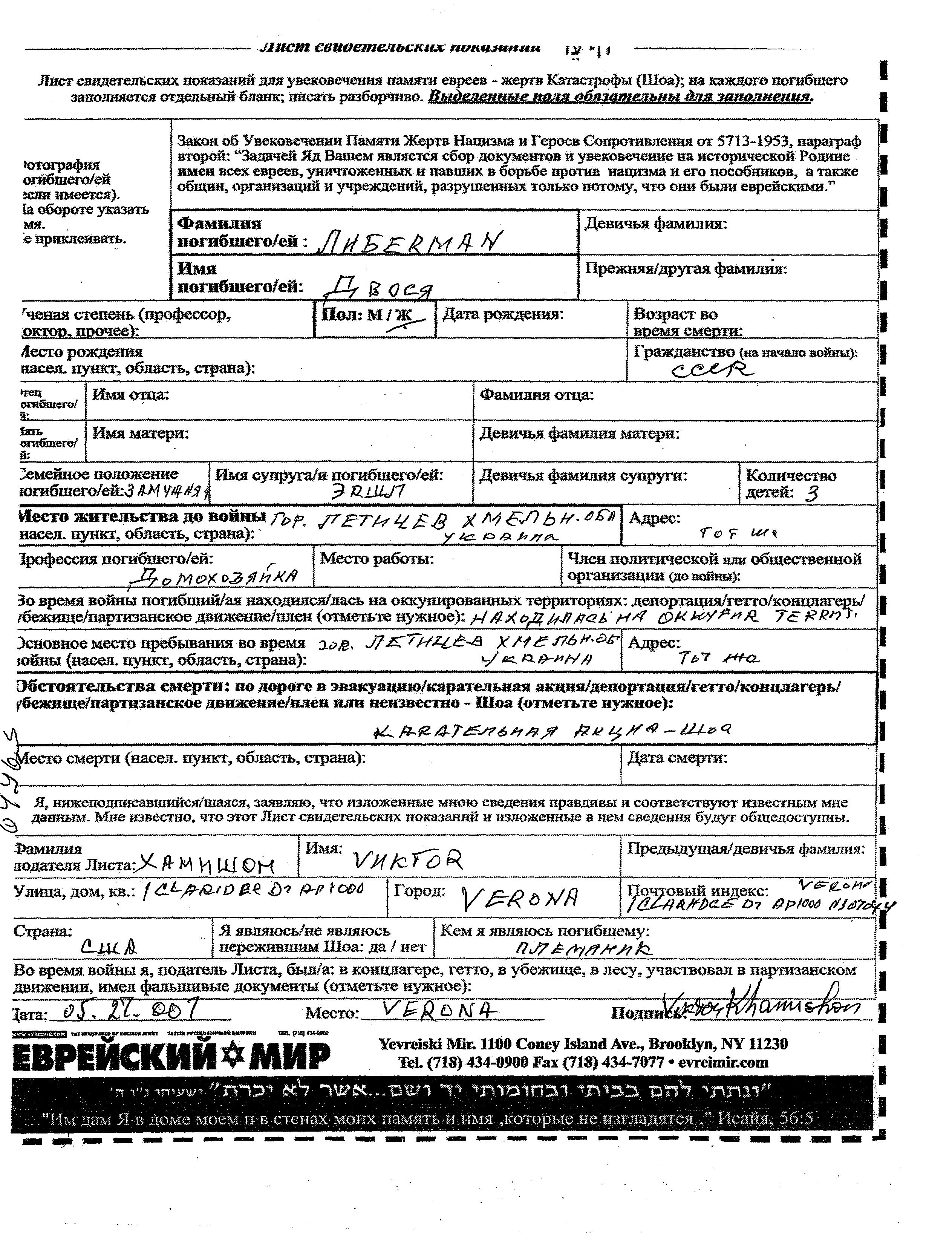 Liberman Dvosya Letichev, Ukraine (USSR) Page of Testimony