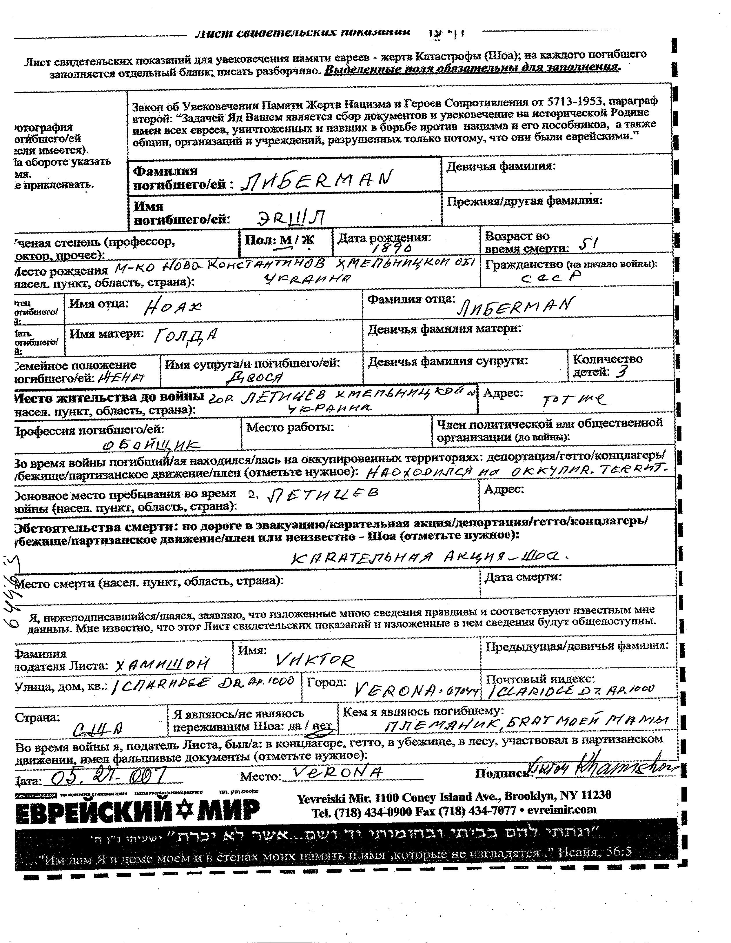Liberman Ershl 1890 Letichev, Ukraine (USSR) Page of Testimony