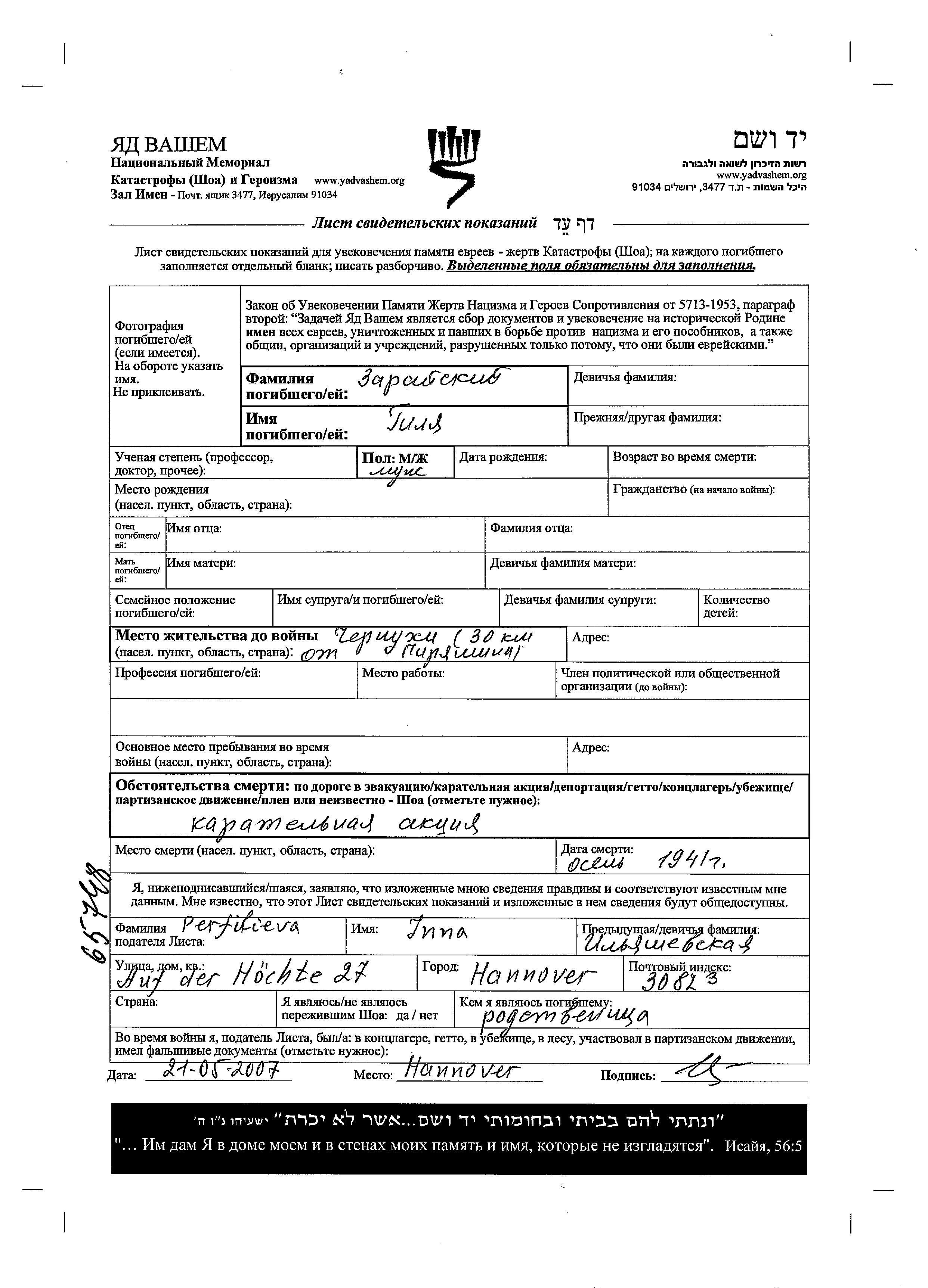 Gilya Zaraiski. Prior to WWII he lived in Chernukhi, Ukraine (USSR). During the war he was in Chernukhi, Ukraine (USSR). Gilya was murdered in the Shoah. Place of death: Chernukhi, Ukraine (USSR), 10/1941.