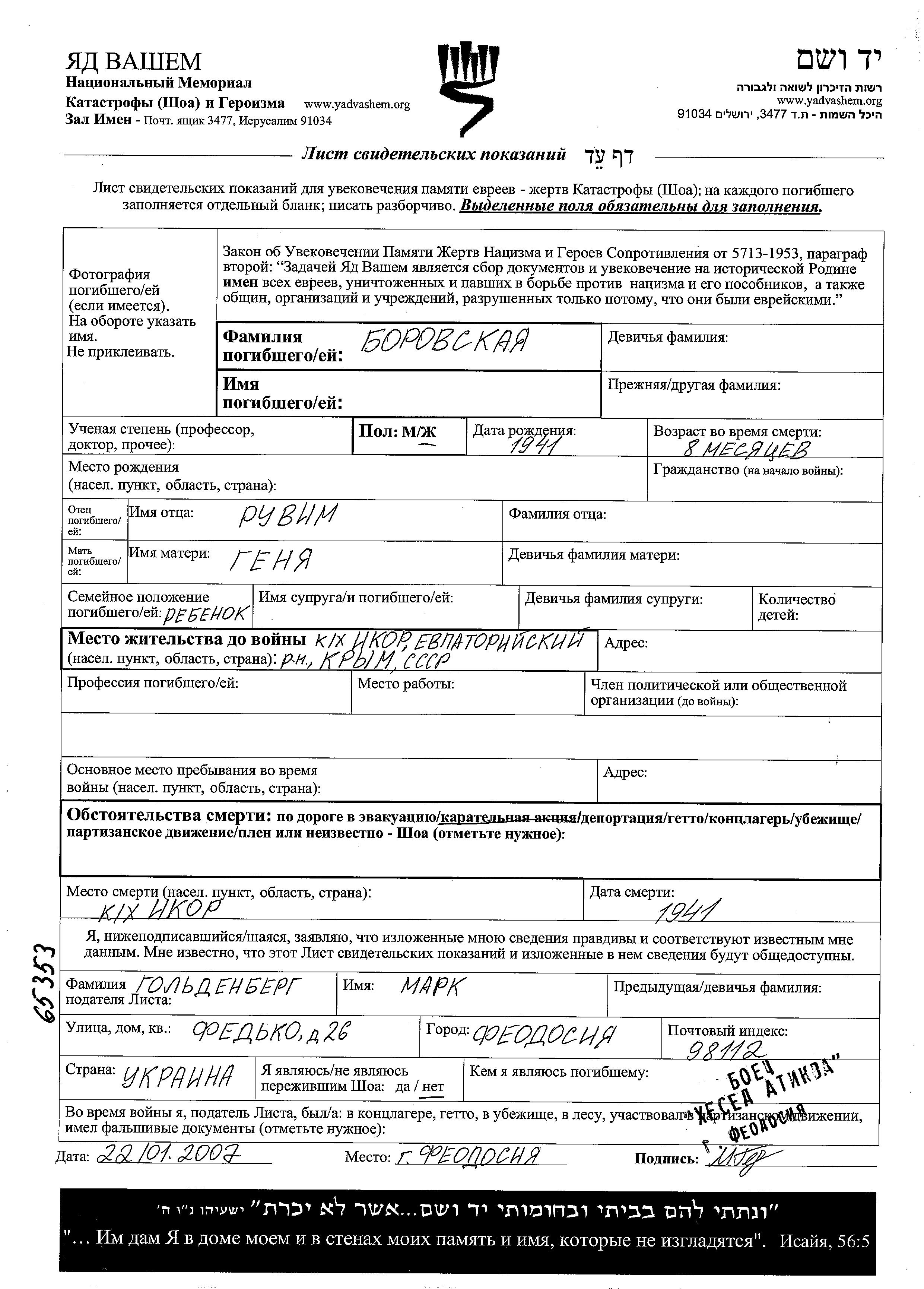 Borovskaya First name unknown Ikor, Russia (USSR) Page of Testimony