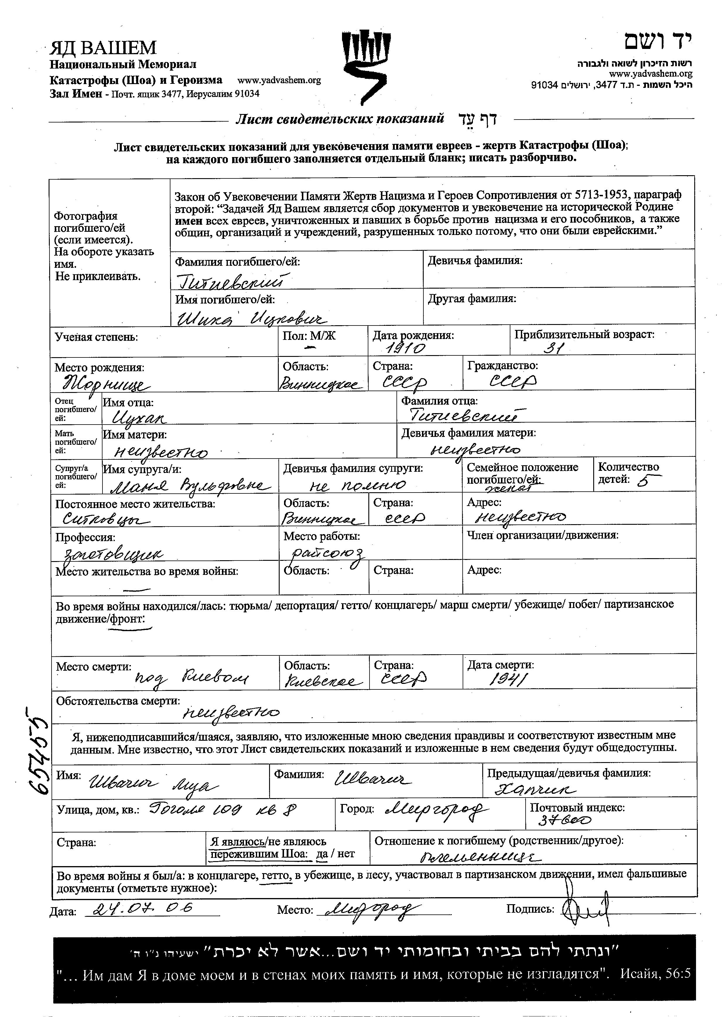 Shika Titiyevski was born in Zhornishche, Ukraine (USSR), 1910 to Itzkhak. He was a state purchase agent and married to Manya. Prior to WWII he lived in Sitkovtsy, Ukraine (USSR). During the war he was in the Soviet armed forces. Shika was killed in military service in WWII. Place of death: Kiev, Ukraine (USSR), 1941.