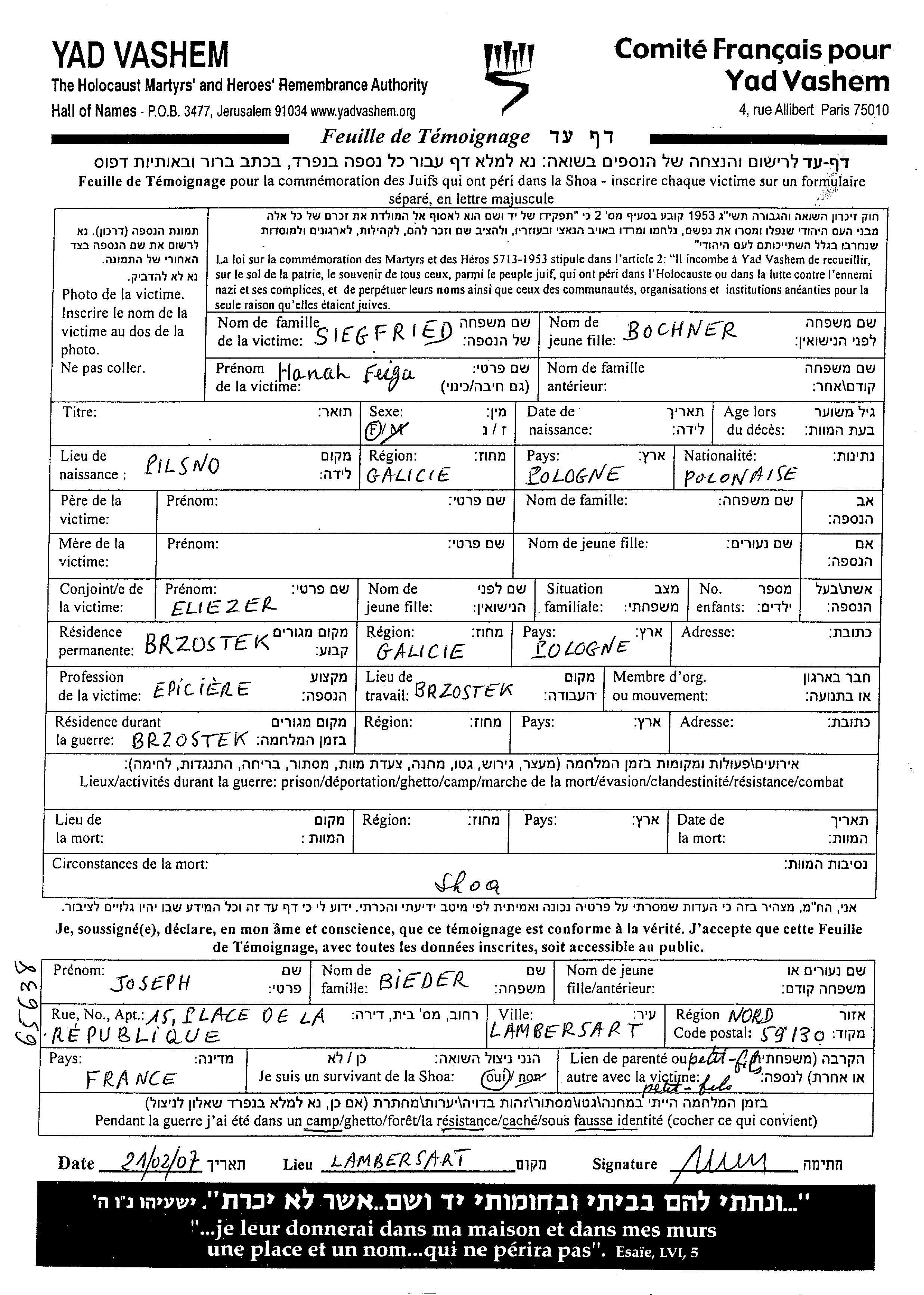 Hanah Feiga Siegfried nee Bochner was born in Pilsno, Poland. She was an epiciere and married to Eliezer. Prior to WWII she lived in Brzostek, Poland. During the war she was in Brzostek, Poland. Hanah Feiga was murdered in the Shoah.