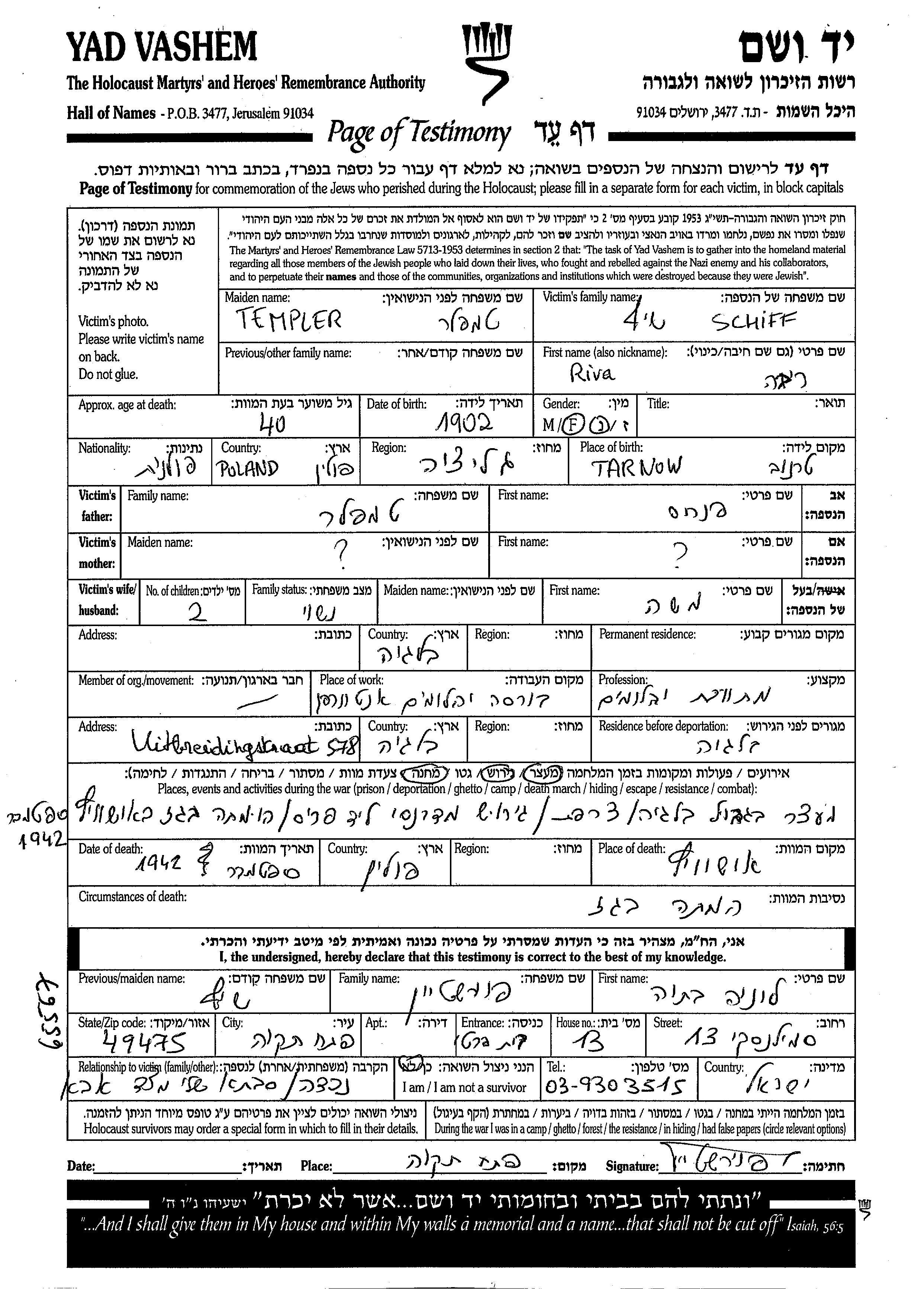 Riva Schiff nee Templer was born in Tarnow, Poland, 1902 to Pinkhas. She was a tanner and married to Moshe. Prior to WWII she lived in Belgium. During the war she was in Belgium.