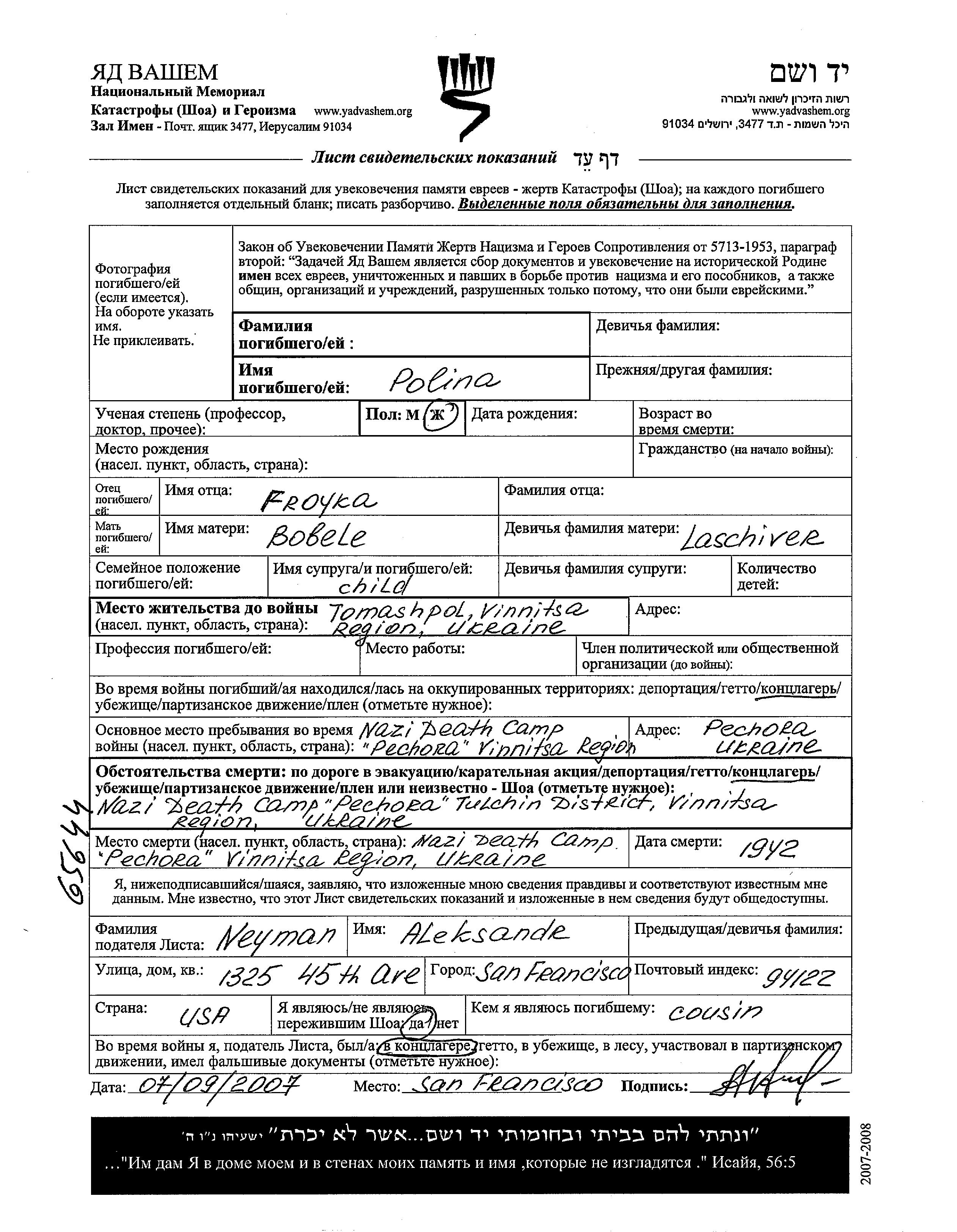 Surname unknown Polina Tomashpol, Ukraine (USSR) Page of Testimony