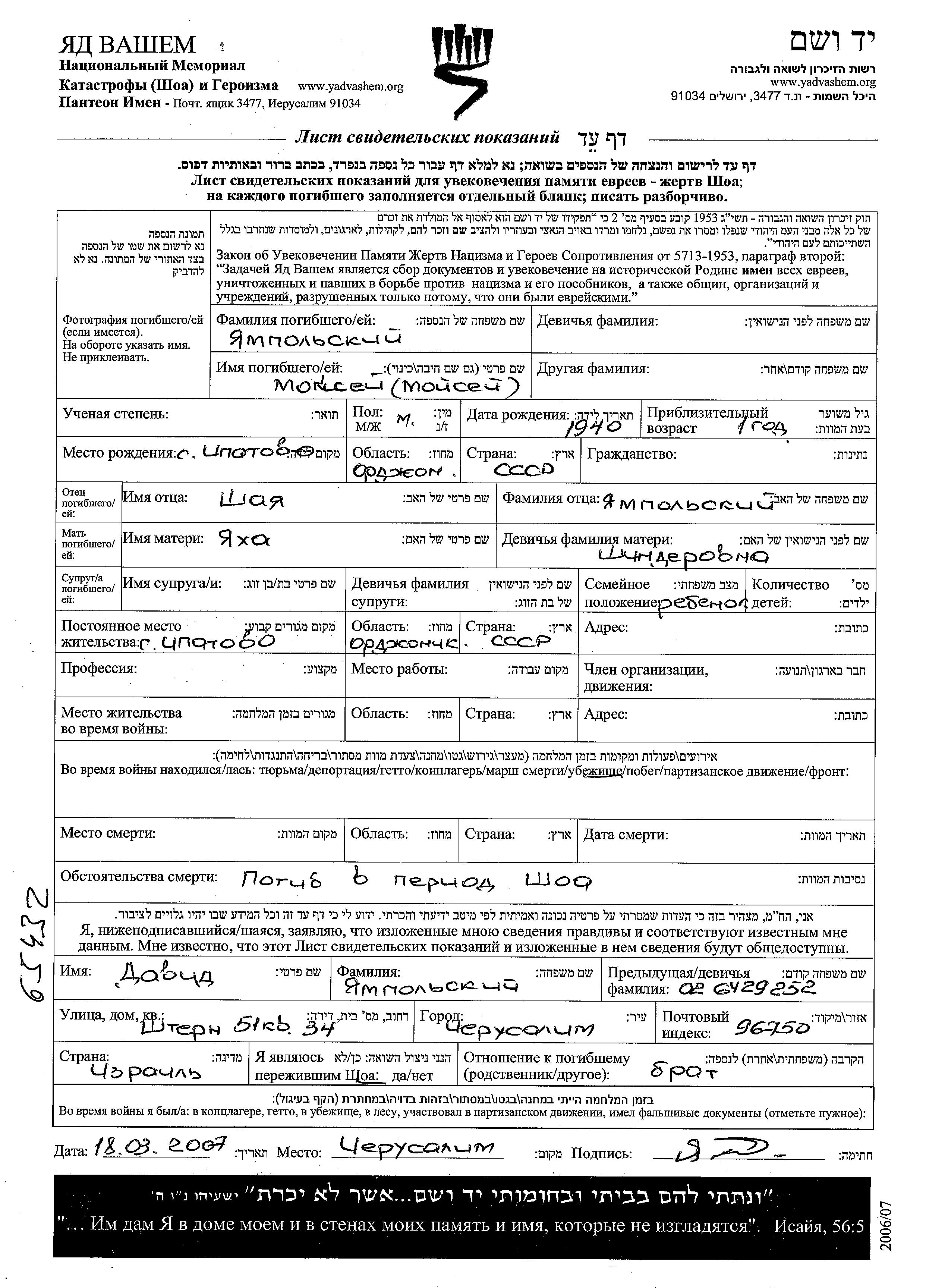 Moisei Yampolski was born in Ipatovo, Russia (USSR), 1940 to Shaya and Yakha nee Shinderova. He was child. Prior to WWII he lived in Ipatovo, Russia (USSR). Moisei was murdered in the Shoah.