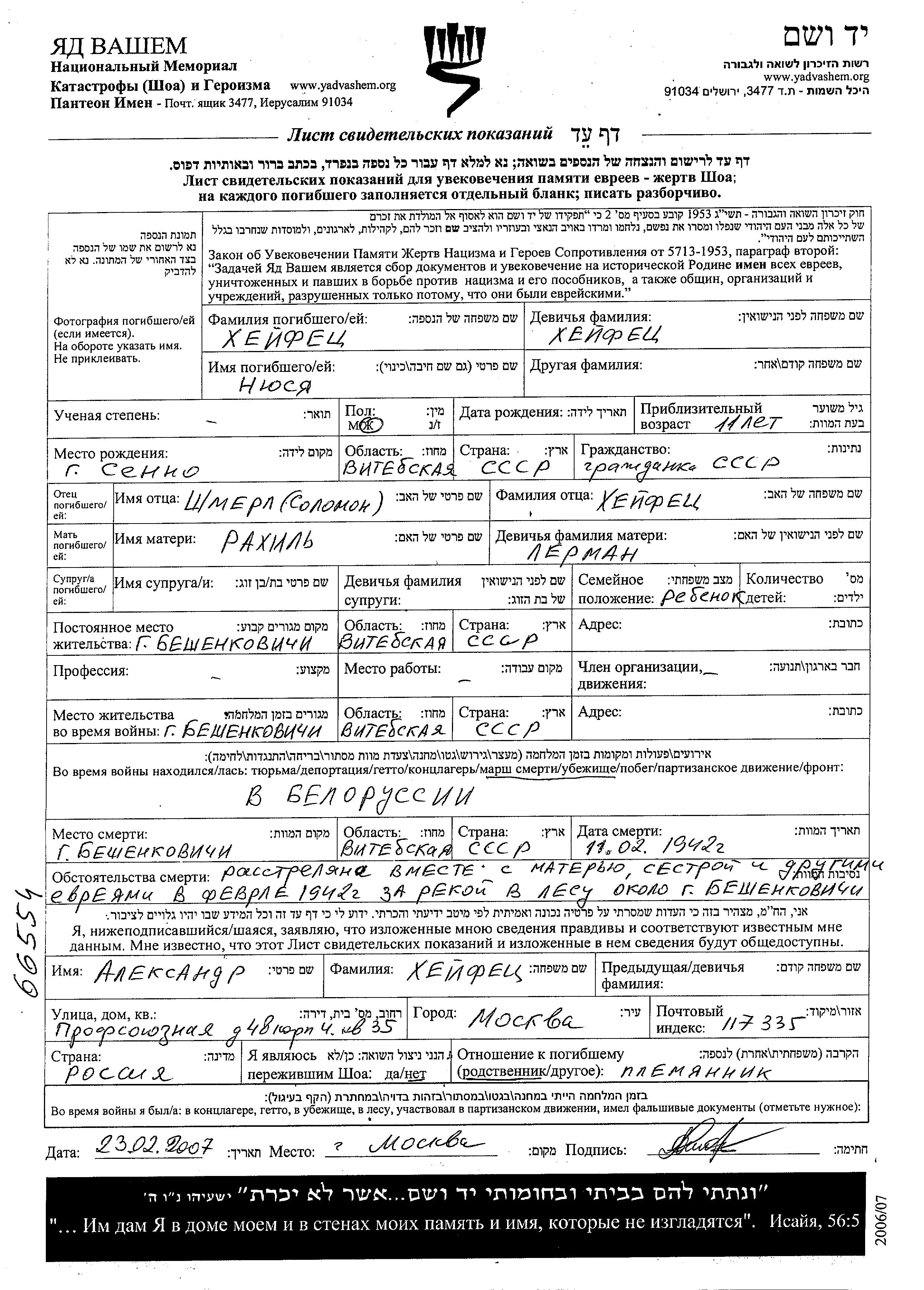 Kheifetz Nyusya Beshenkovichi, Belorussia (USSR) Page of Testimony