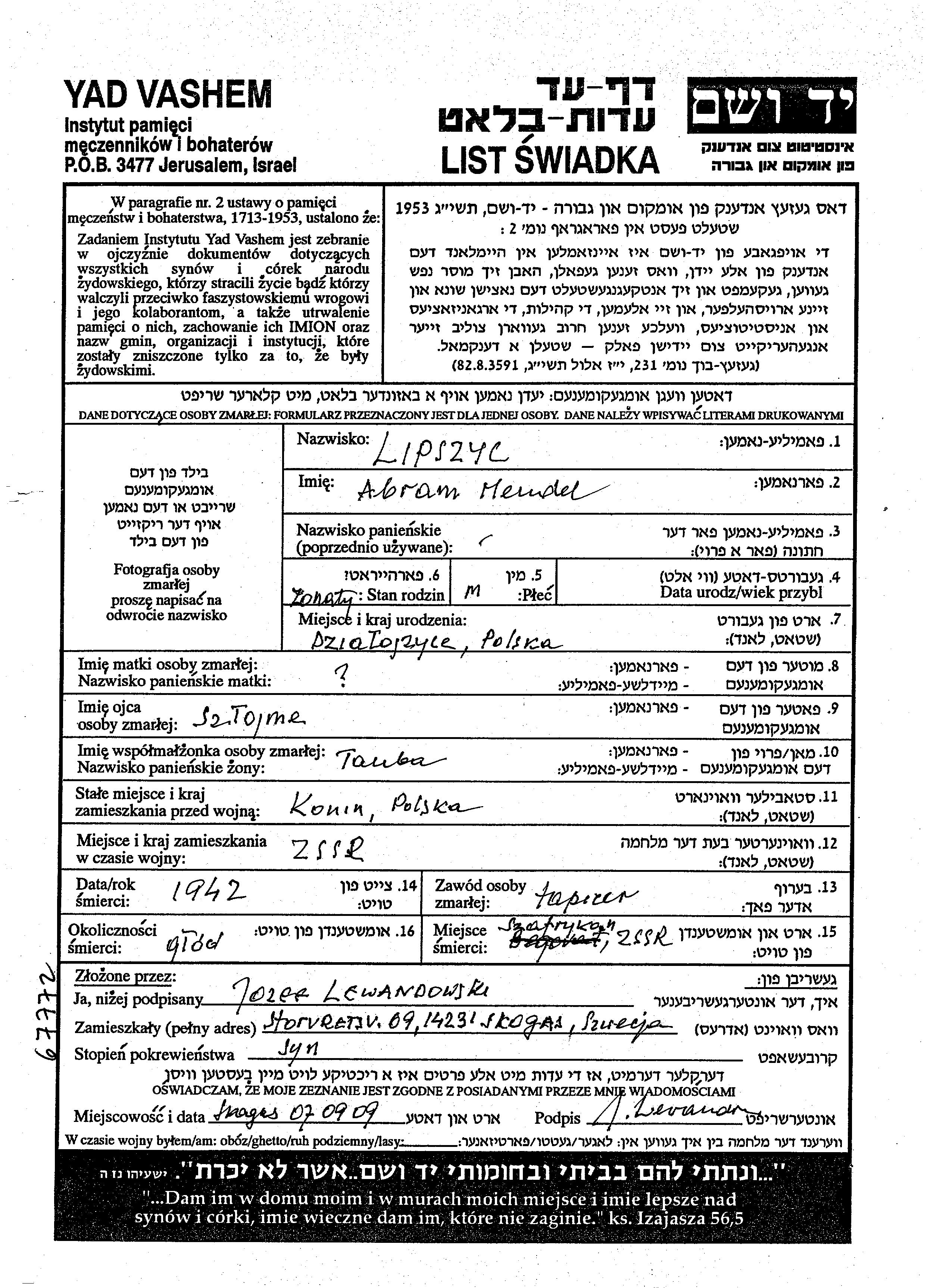 Lipszyc Abram Mendel Konin, Poland Page of Testimony