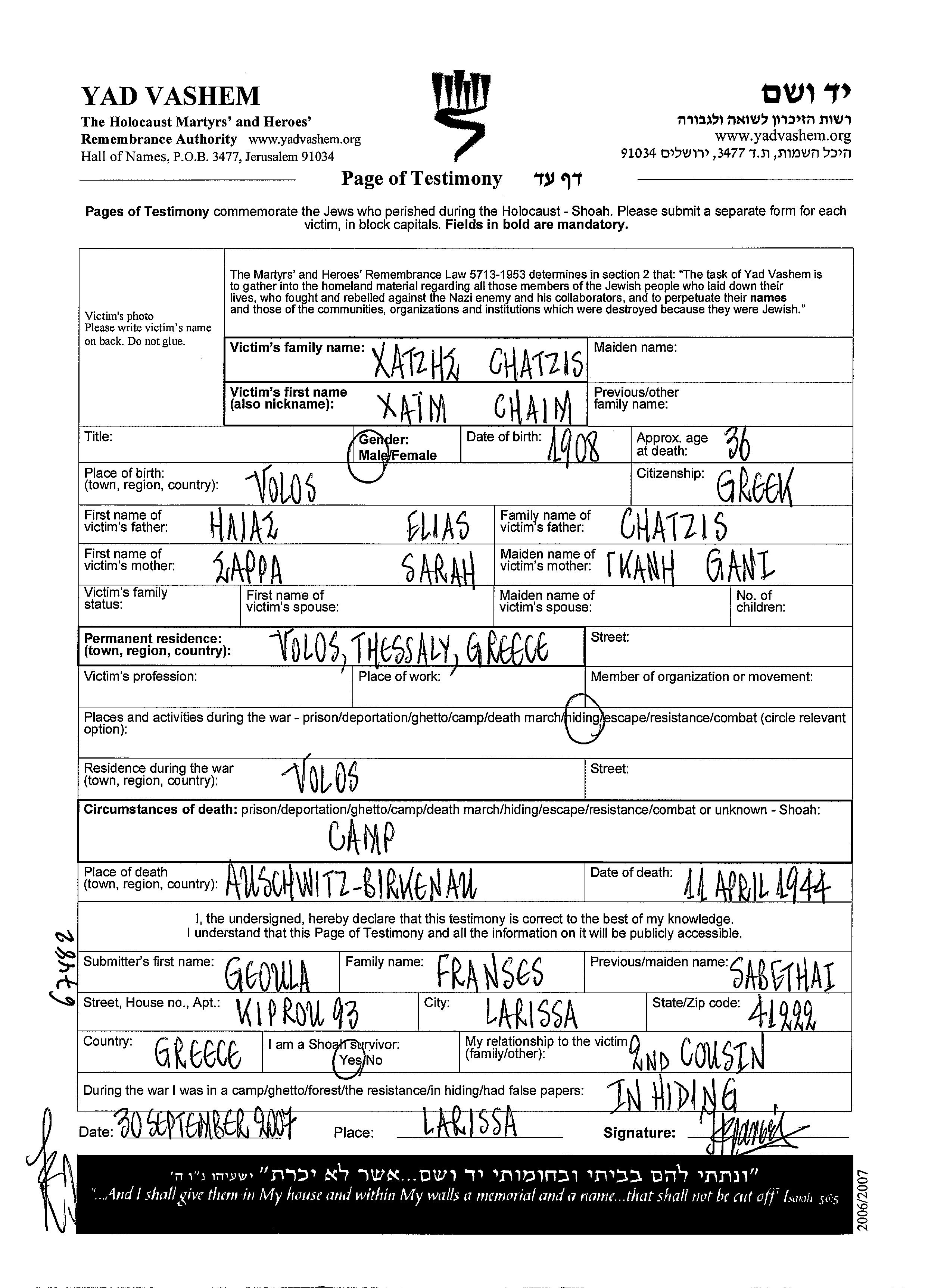Chatzis Chaim 1908 Volos, Greece Page of Testimony