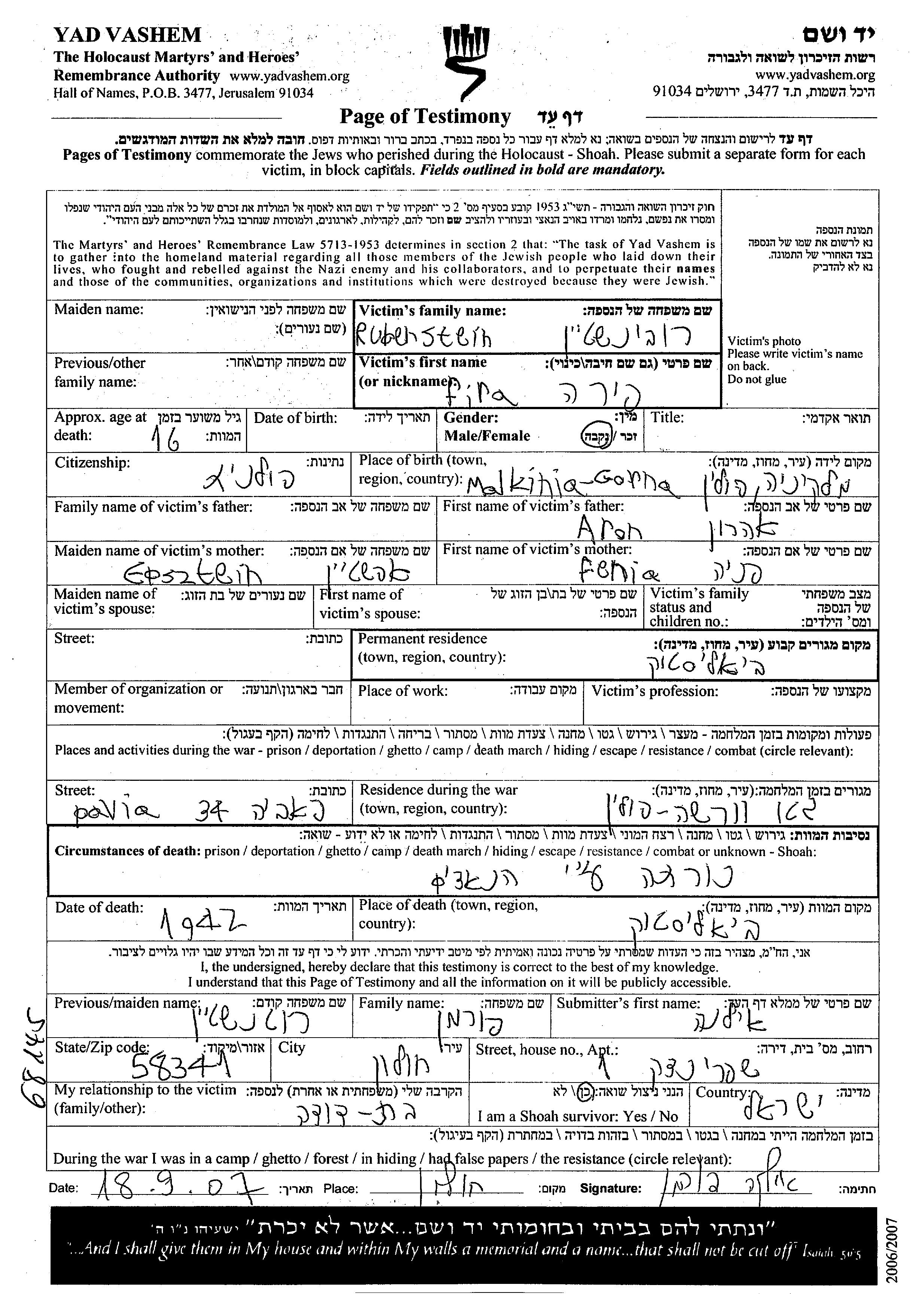 Fira Rubenstein was born in Malkinia Gorna, Poland to Aron and Fenia nee Epsztein. She was teenager. Prior to WWII she lived in Bialystok, Poland. During the war she was in Warsaw, Poland. Fira was murdered in the Shoah. Place of death: Bialystok, Poland, 1942.