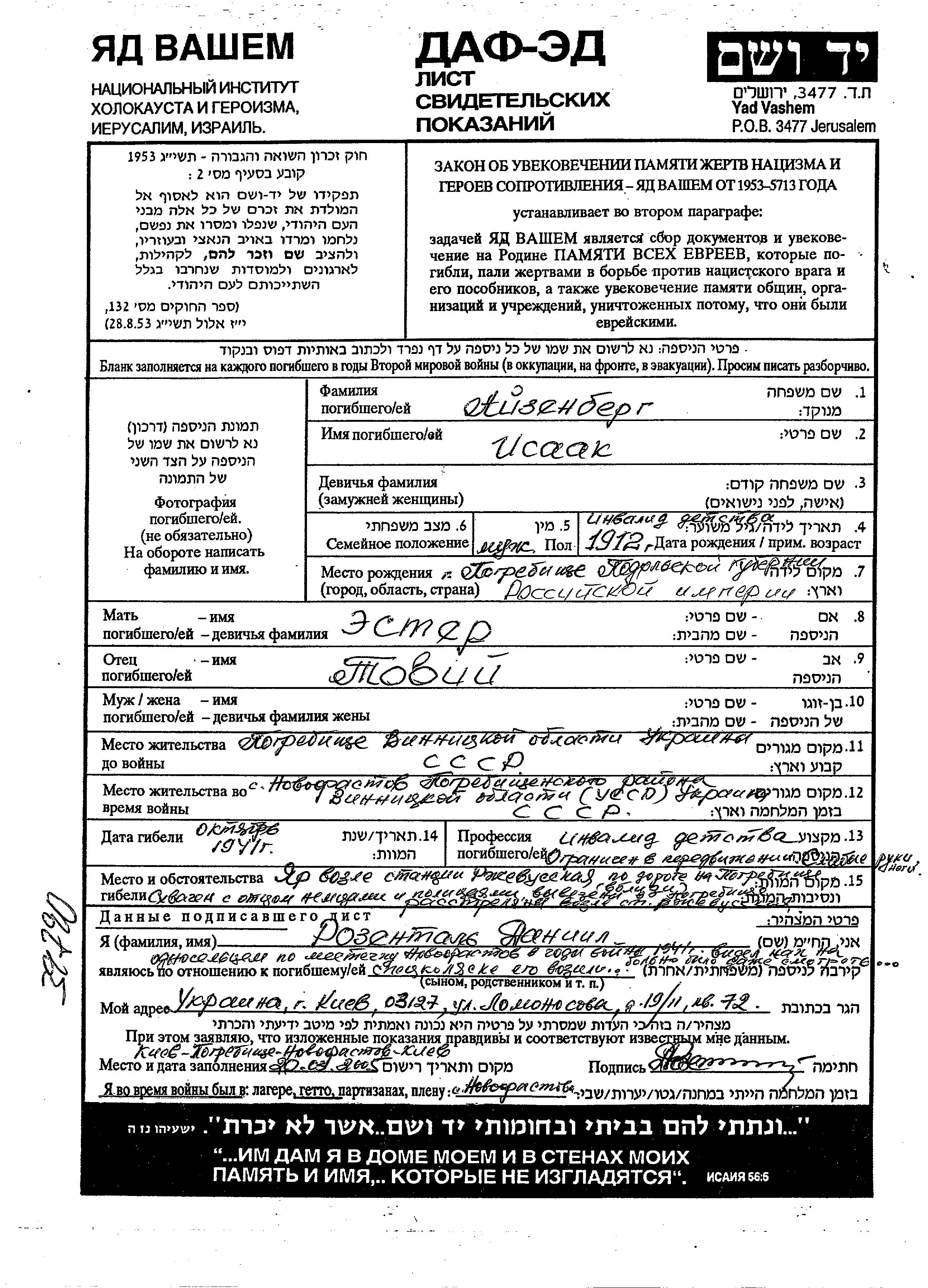 Isaak Aizenberg was born in Pogrebishche, Ukraine (USSR), 1912 to Tovi and Ester. He was a disabled and single. Prior to WWII he lived in Pogrebishche, Ukraine (USSR). During the war he was in Pogrebishche, Ukraine (USSR). Isaak was murdered in the Shoah. Place of death: Vinnitsa, Ukraine (USSR), 10/1941.