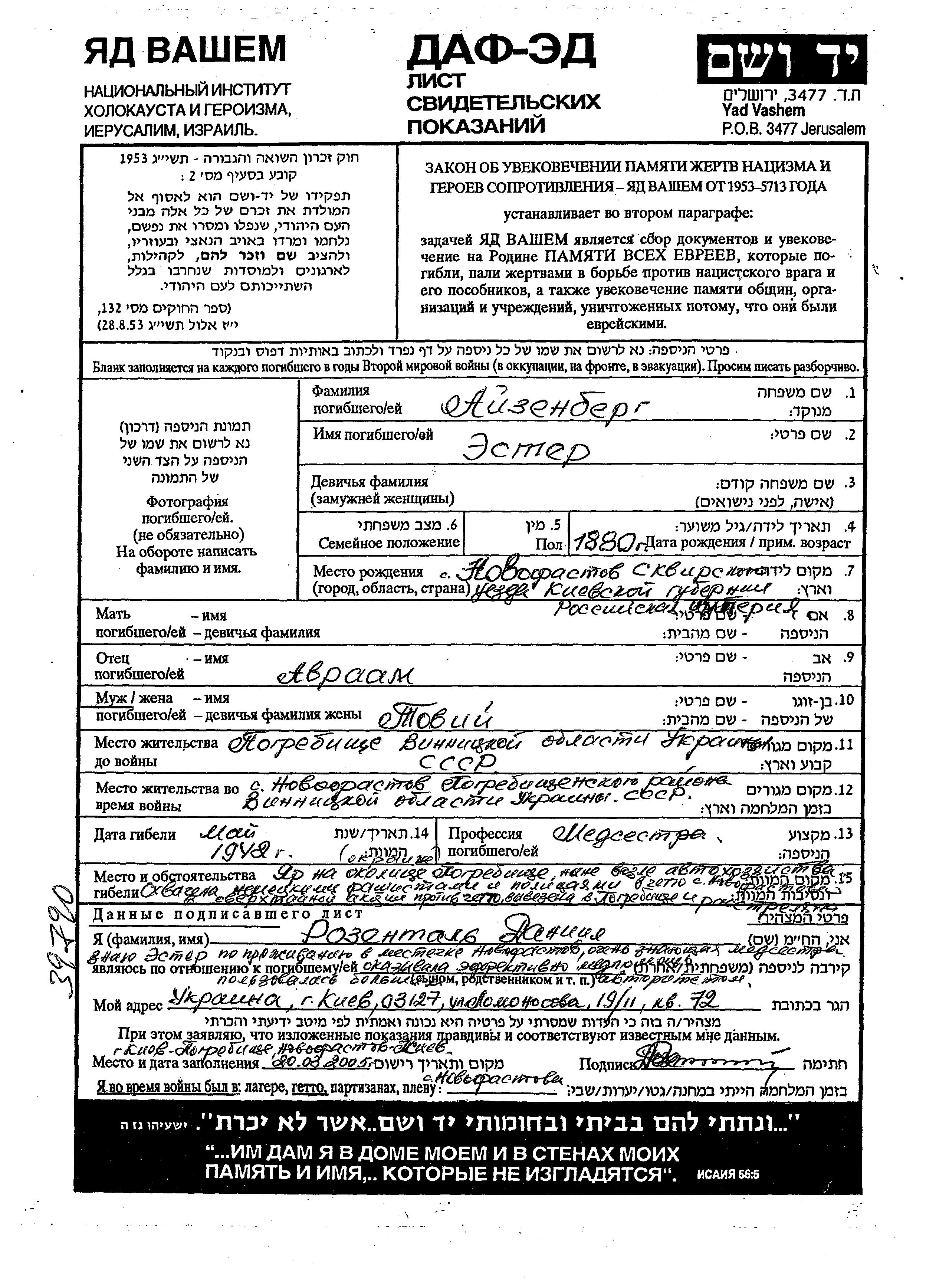 Ester Aizenberg was born in Novofastov, Ukraine (USSR), 1880 to Avraam. She was a nurse and married to Toviy. Prior to WWII she lived in Pogrebisce, Ukraine (USSR). During the war she was in Ghetto. Ester was murdered in the Shoah. Place of death: Pogrebisce, Ukraine (USSR), 05/1942.