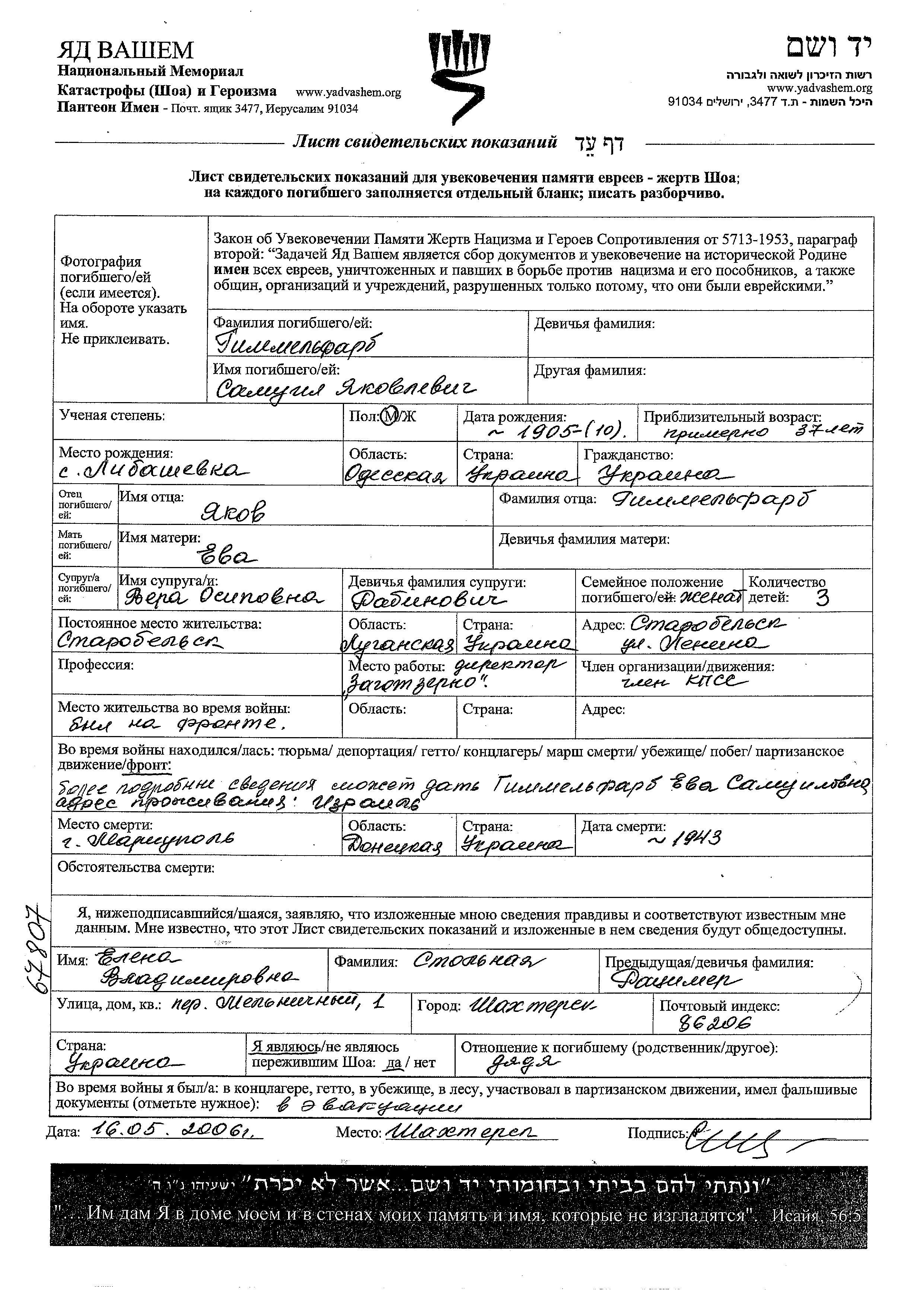 Samuil Gimmelfarb was born in Lyubashevka, Ukraine (USSR), 1905 to Yakov and Yeva. He was a direktor and married to Vera nee Rabinovich. Prior to WWII he lived in Starobelsk, Ukraine (USSR). During the war he was in the Soviet armed forces. Samuil was killed in military service in WWII. Place of death: Mariupol, Ukraine (USSR), 1943.
