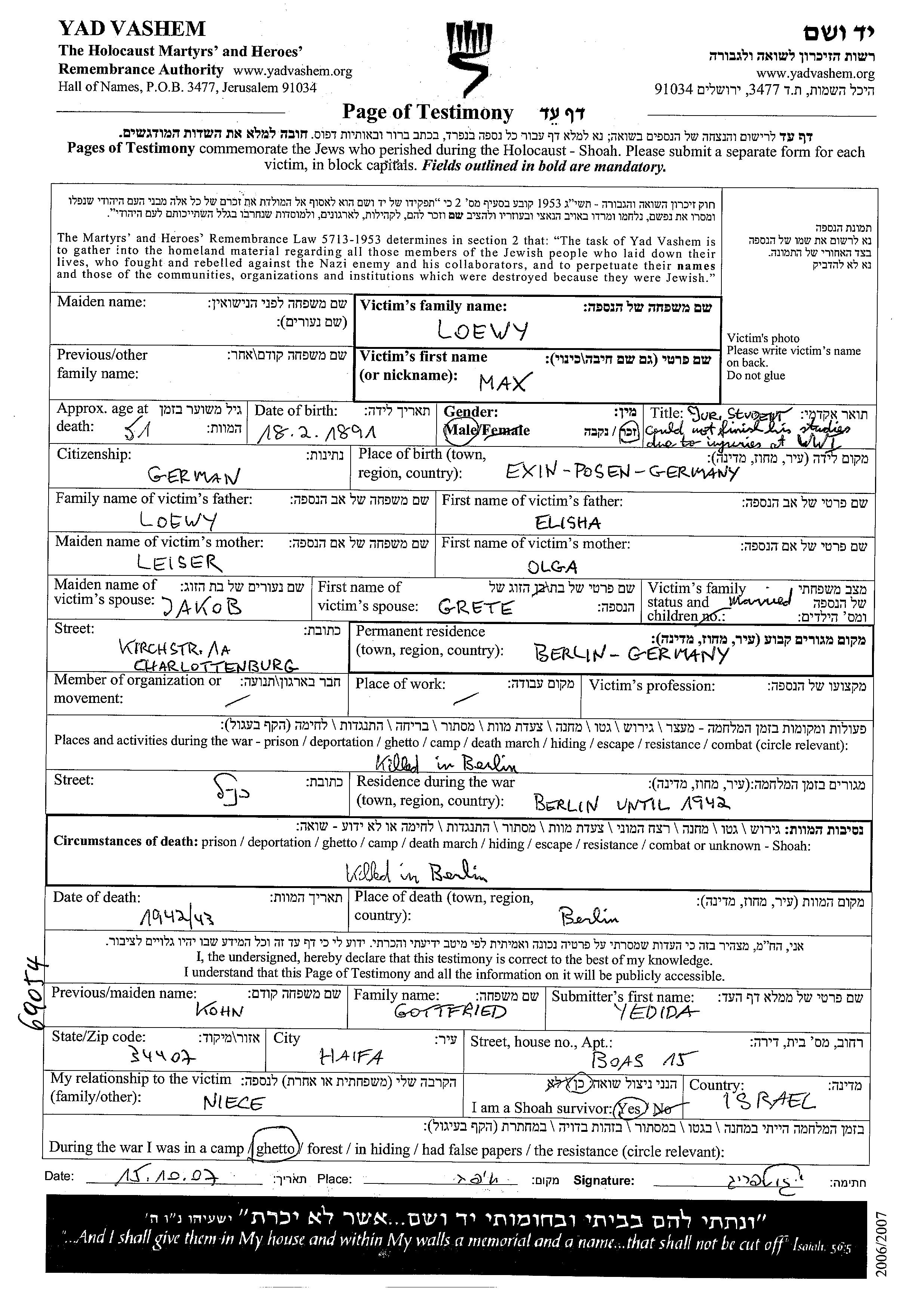 Max Loewy was born in Exin, Poland, 1891 to Elisha and Olga nee Leiser. He was married to Grete nee Jakob. Prior to WWII he lived in Berlin Charlottenburg, Germany. During the war he was in Berlin Charlottenburg, Germany. Max was murdered in the Shoah. Place of death: Berlin, Germany, 1942.