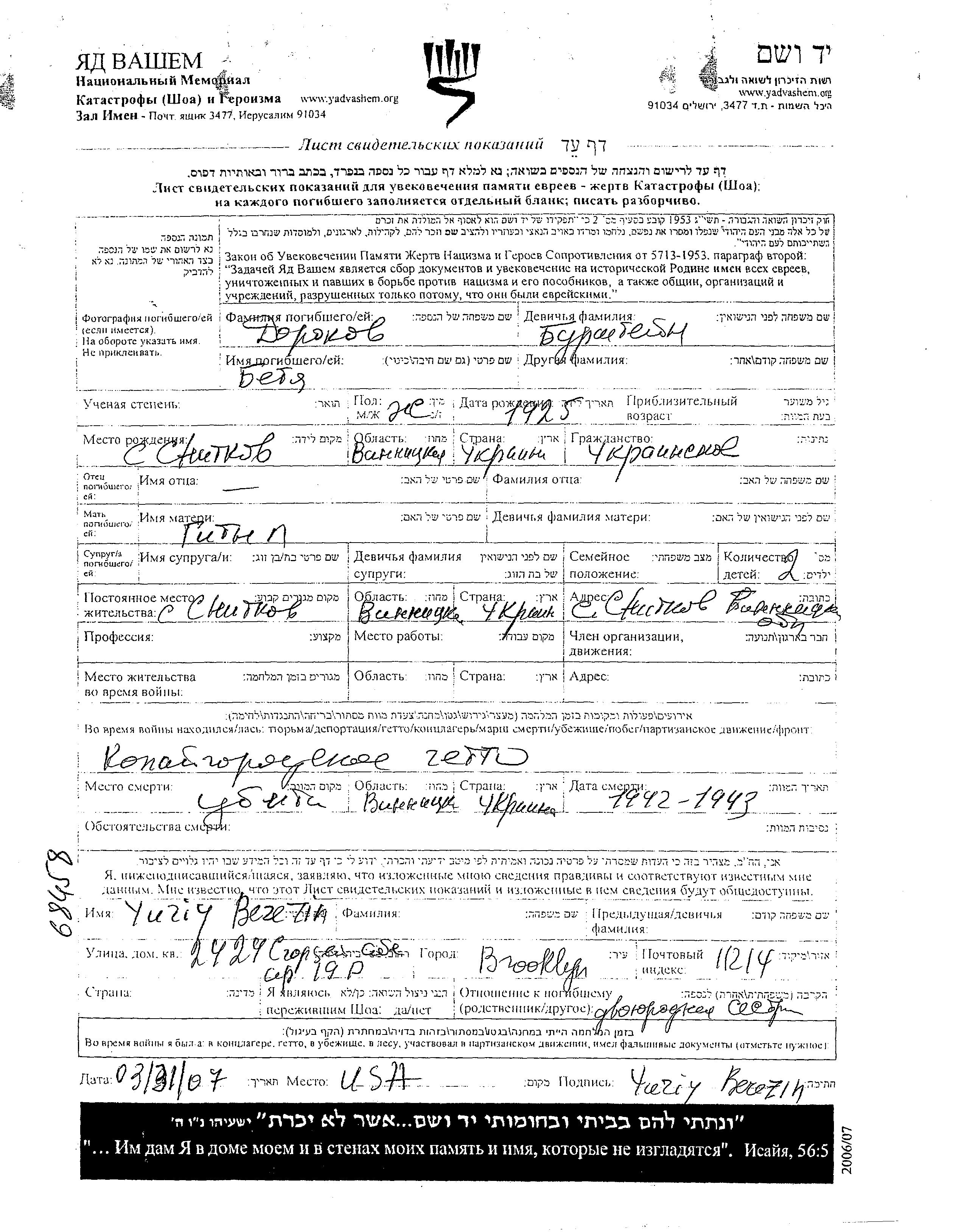 Betya Dorokov nee Burshtein was born in Snitkov, Ukraine (USSR), 1925 to Gityl. She was married. Prior to WWII she lived in Snitkov, Ukraine (USSR). During the war she was in Kopaygorod, Ukraine (USSR). Betya was murdered in the Shoah. Place of death: Kopaygorod, Ukraine (USSR), 1942.