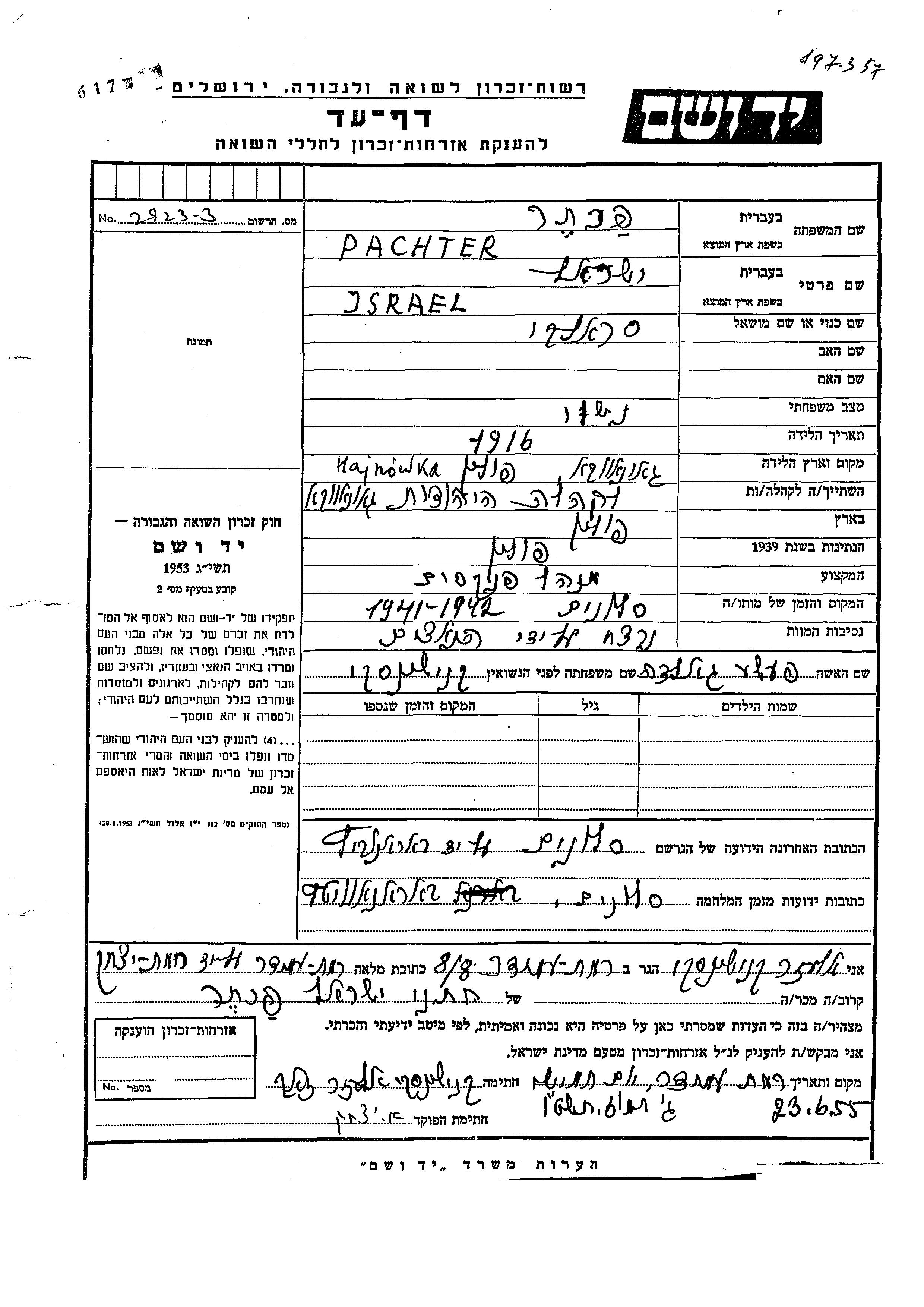 Israel Pachter was born in Hajnówka, Poland, 1916. He was a bookkeeper and married to Peshe Golda nee Knishinski. Prior to WWII he lived in Hajnówka, Poland. During the war he was in Slonim, Poland. Israel was murdered in the Shoah. Place of death: Slonim, Poland, 1941.