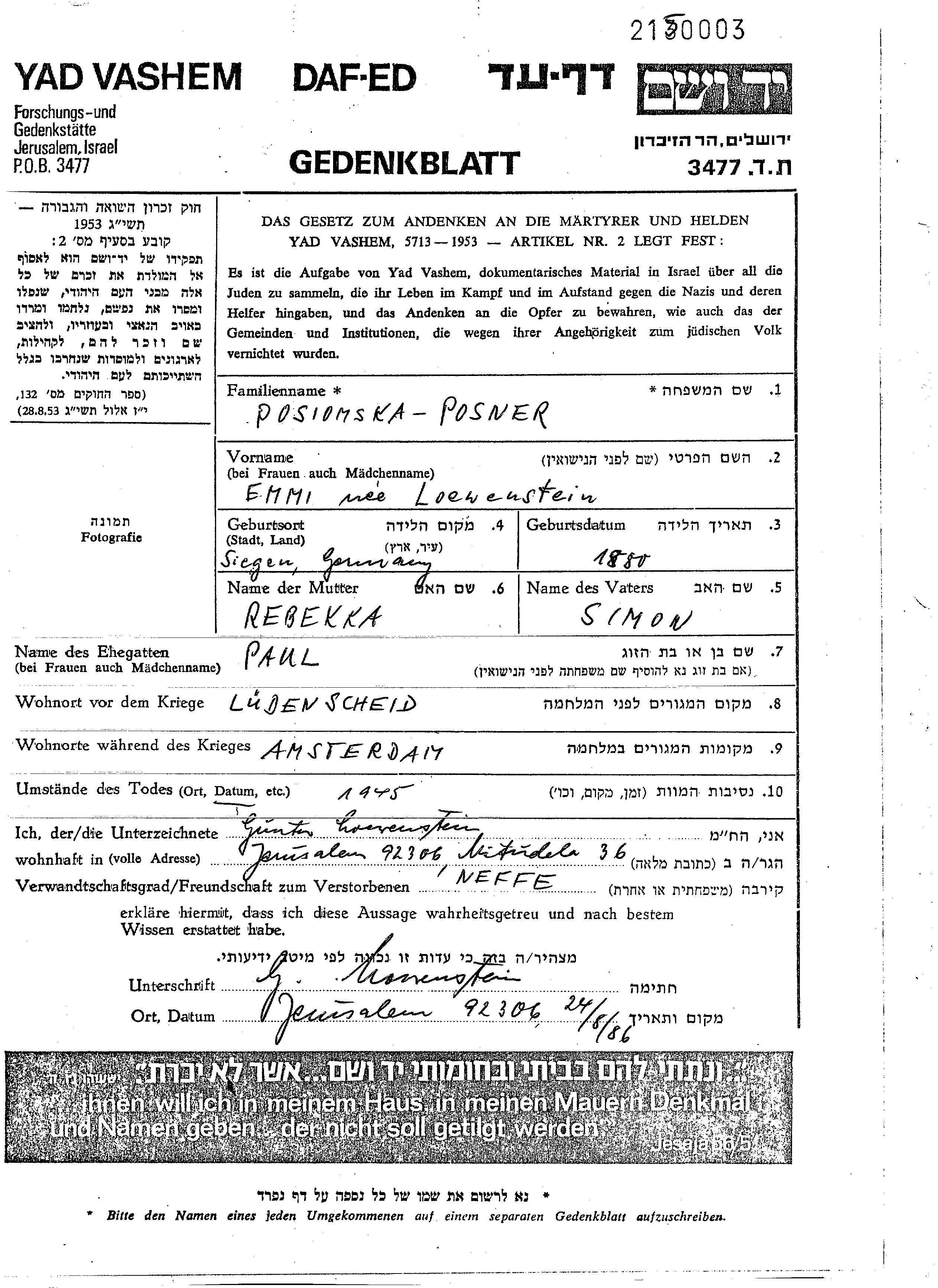 Posiomska Posner Emmi Luedenscheid, Germany Page of Testimony