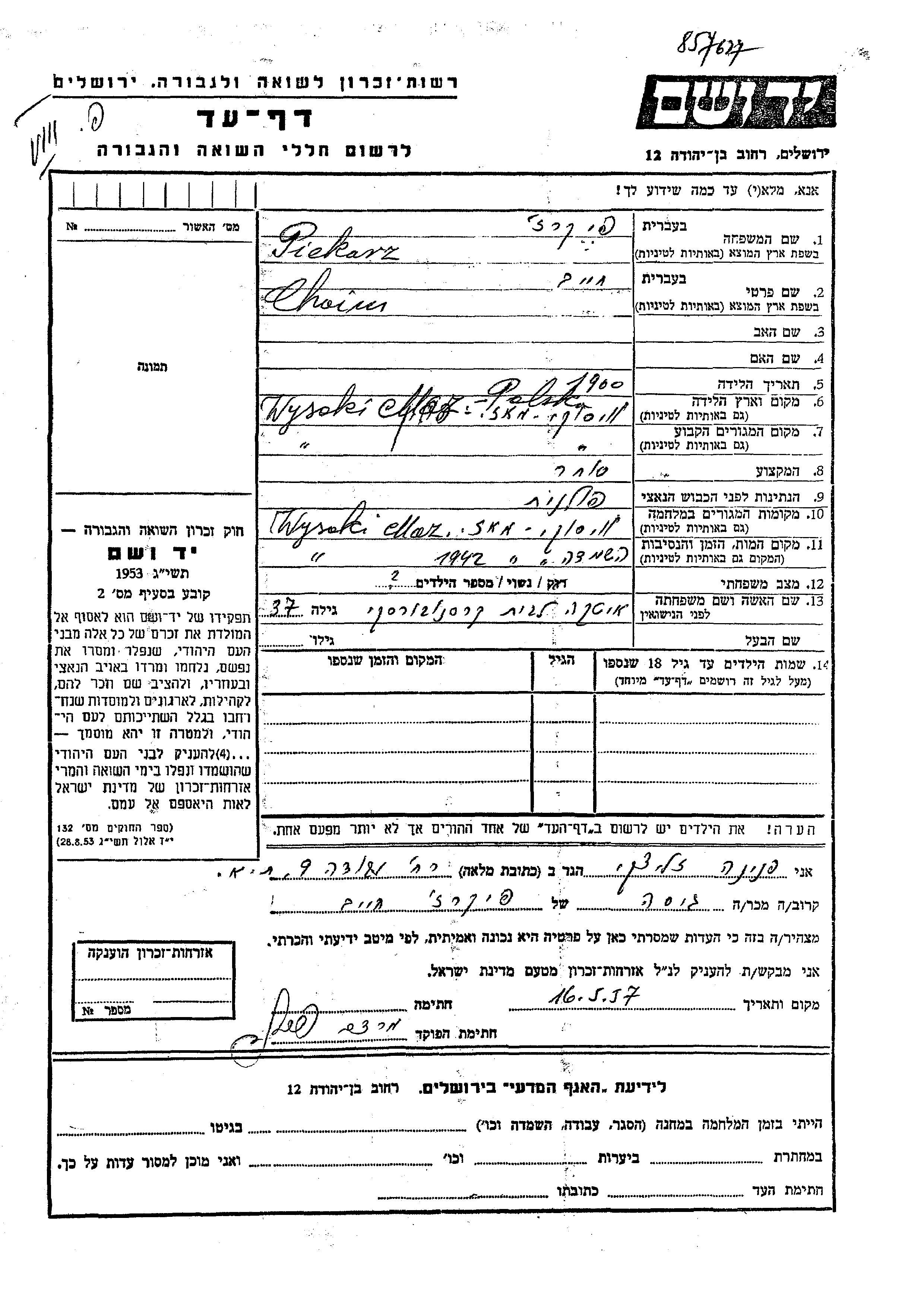 Chaim Piekarz was born in Wysoki Brzeg, Poland, 1900. He was a merchant and married to Itka nee Krasnoborski. Prior to WWII he lived in Wysoki Brzeg, Poland. During the war he was in Wysoki Brzeg, Poland. Chaim was murdered in the Shoah. Place of death: Wysoki Brzeg, Poland, 1942.