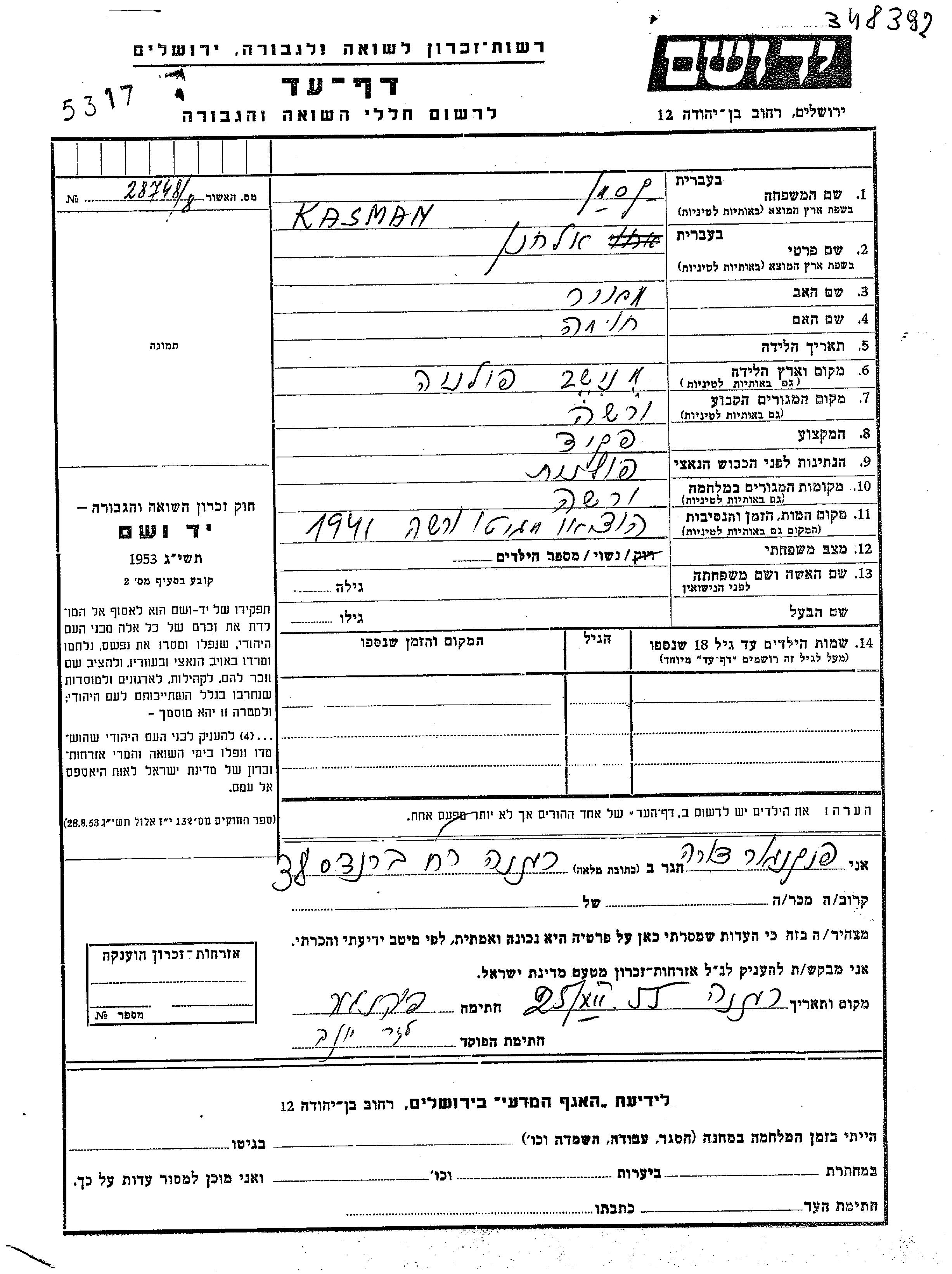 Elkhanan Kasman was born in Mniszew, Poland to Meir and Khuma. He was a clerk and married. Prior to WWII he lived in Warszawa, Poland. During the war he was in Warszawa, Poland. Elkhanan was murdered in the Shoah. Place of death: Warszawa, Poland, 1941.