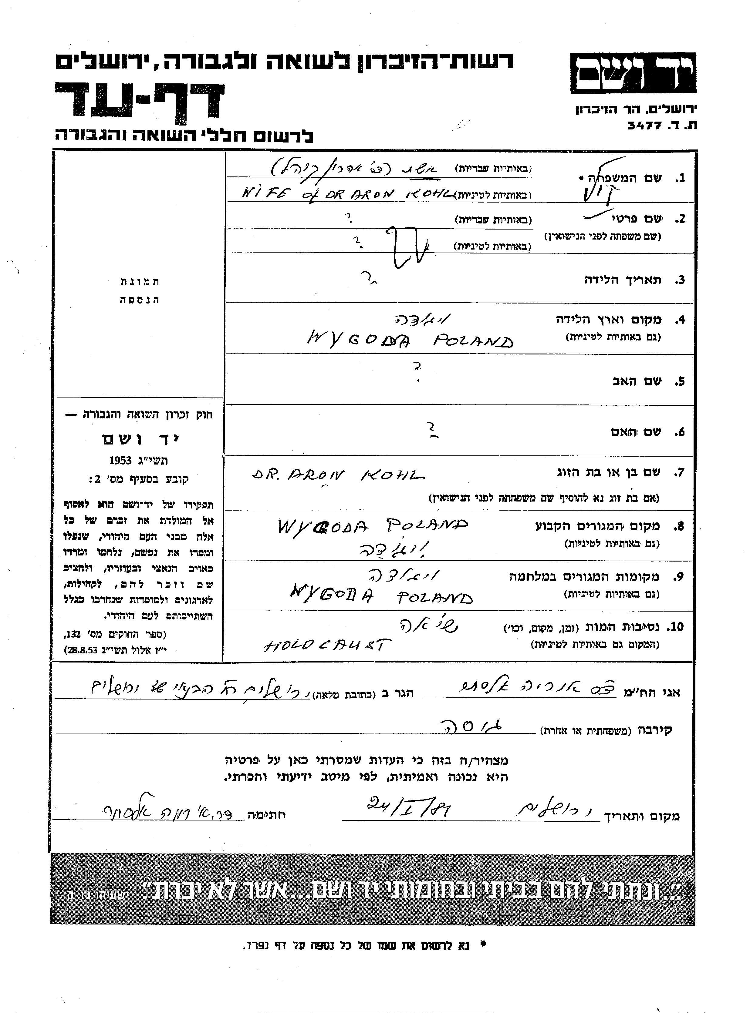 First name unknown Kul Kol was born in Wygoda, Poland. She was married to Aron. Prior to WWII she lived in Wygoda, Poland. During the war she was in Wygoda, Poland. She was murdered in the Shoah.