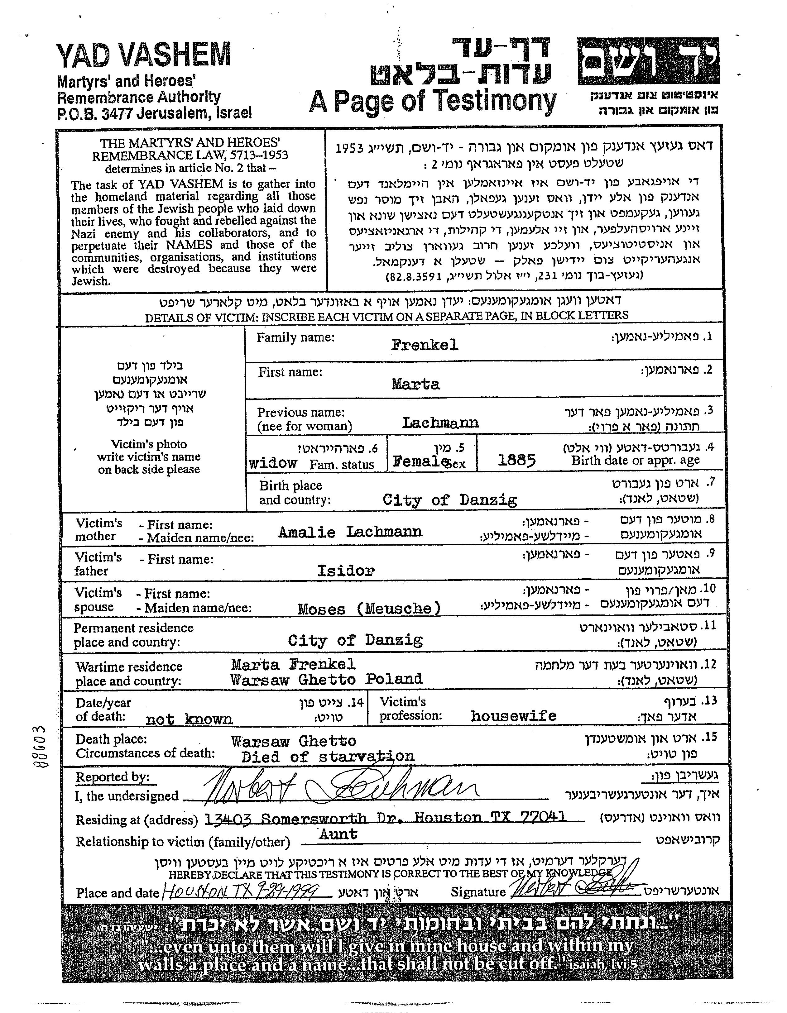 Frenkel Marta 1885 Danzig, Free City of Danzig Page of Testimony