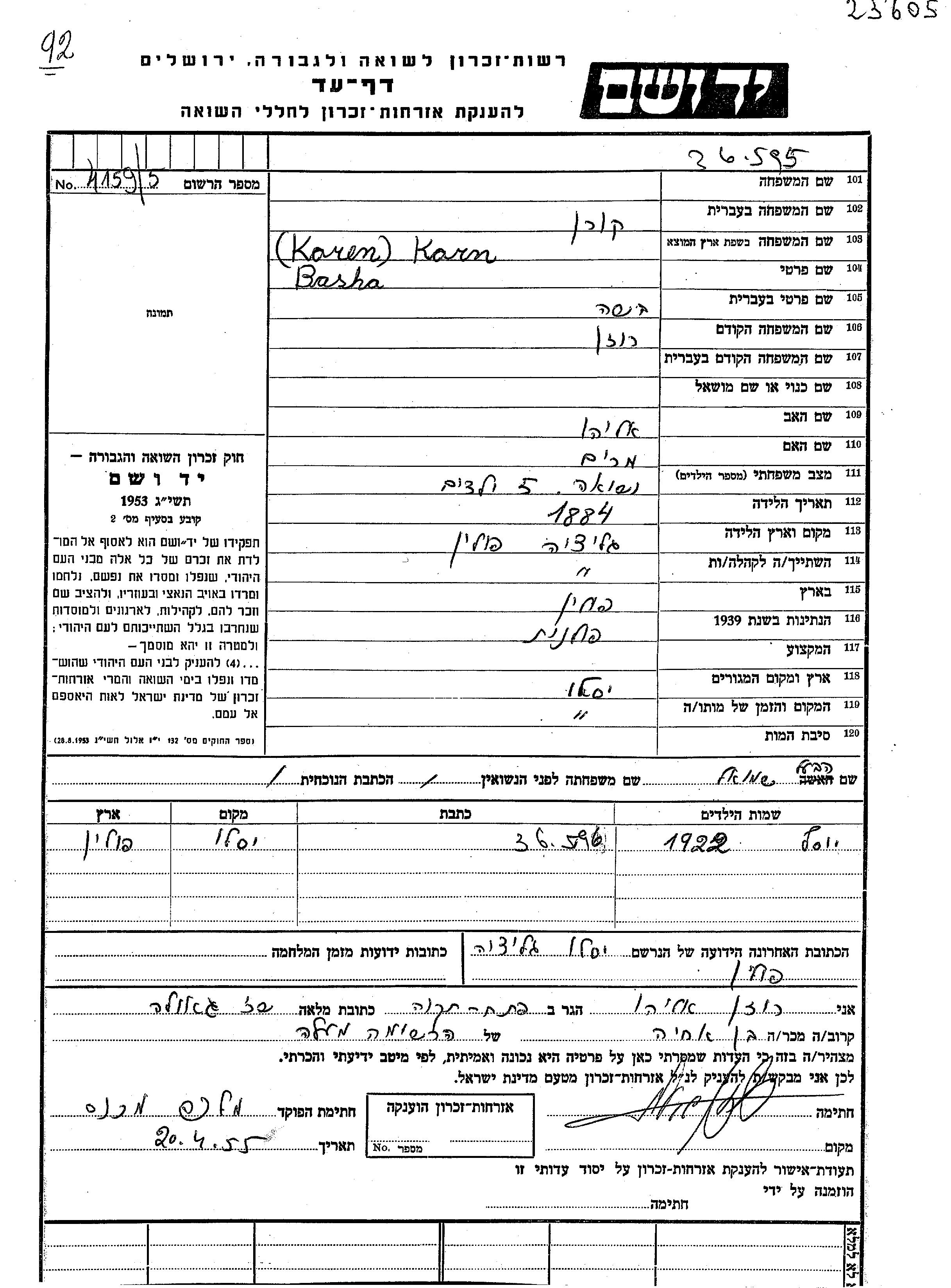 Basha Korn nee Rozen was born in Galicia Region, Poland, 1884 to Eliahu and Miriam. She was married to Shmuel. Prior to WWII she lived in Galicia Region, Poland. During the war she was in Jaslo, Poland. Basha was murdered in the Shoah. Place of death: Jaslo, Murder Site.
