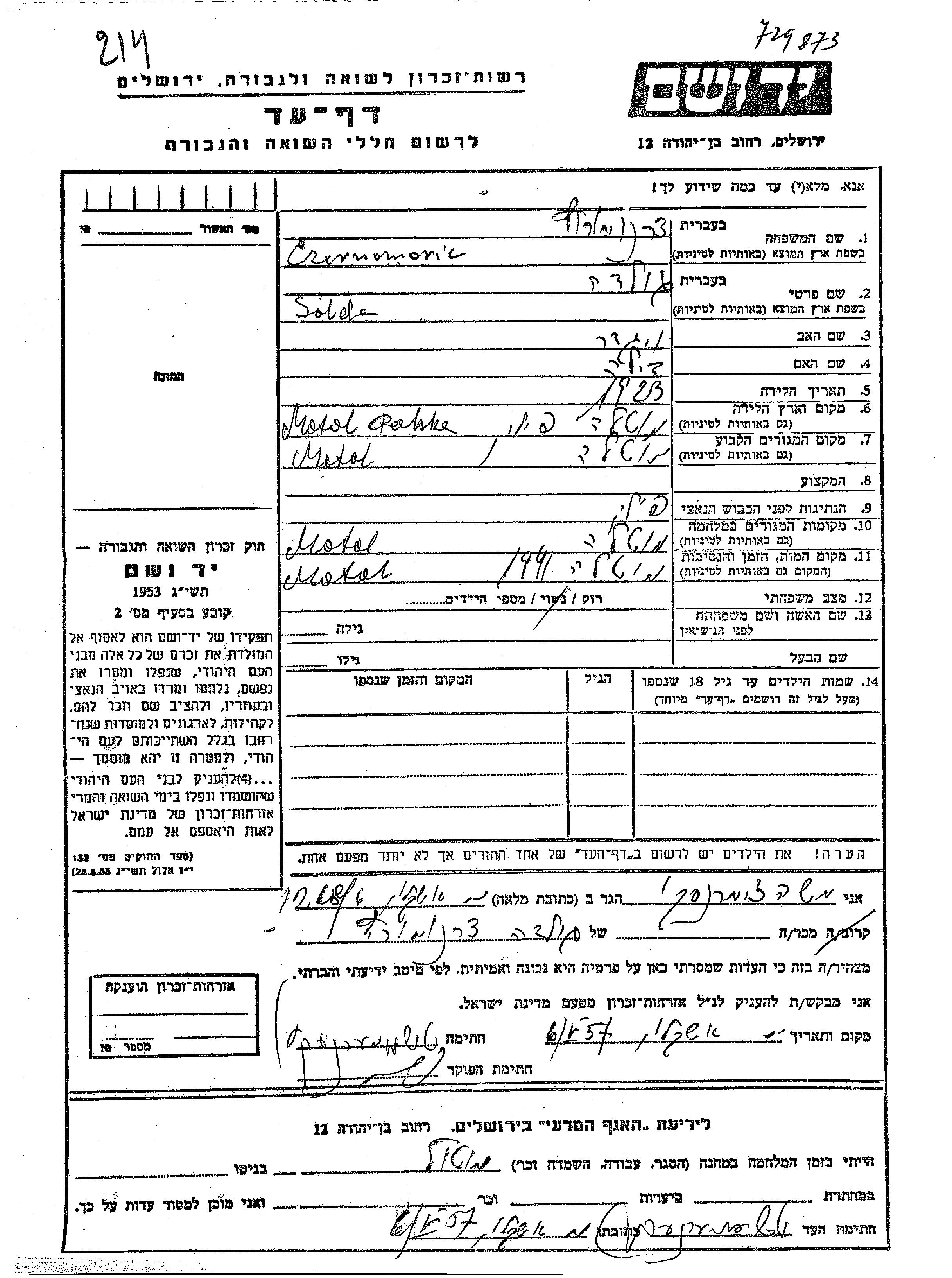 Golda Czernomoric was born in Motol, Poland, 1923 to Vigder and Tzila. She was single. Prior to WWII she lived in Motol, Poland. During the war she was in Motol, Poland. Golda was murdered in the Shoah. Place of death: Motol, Poland, 1941.