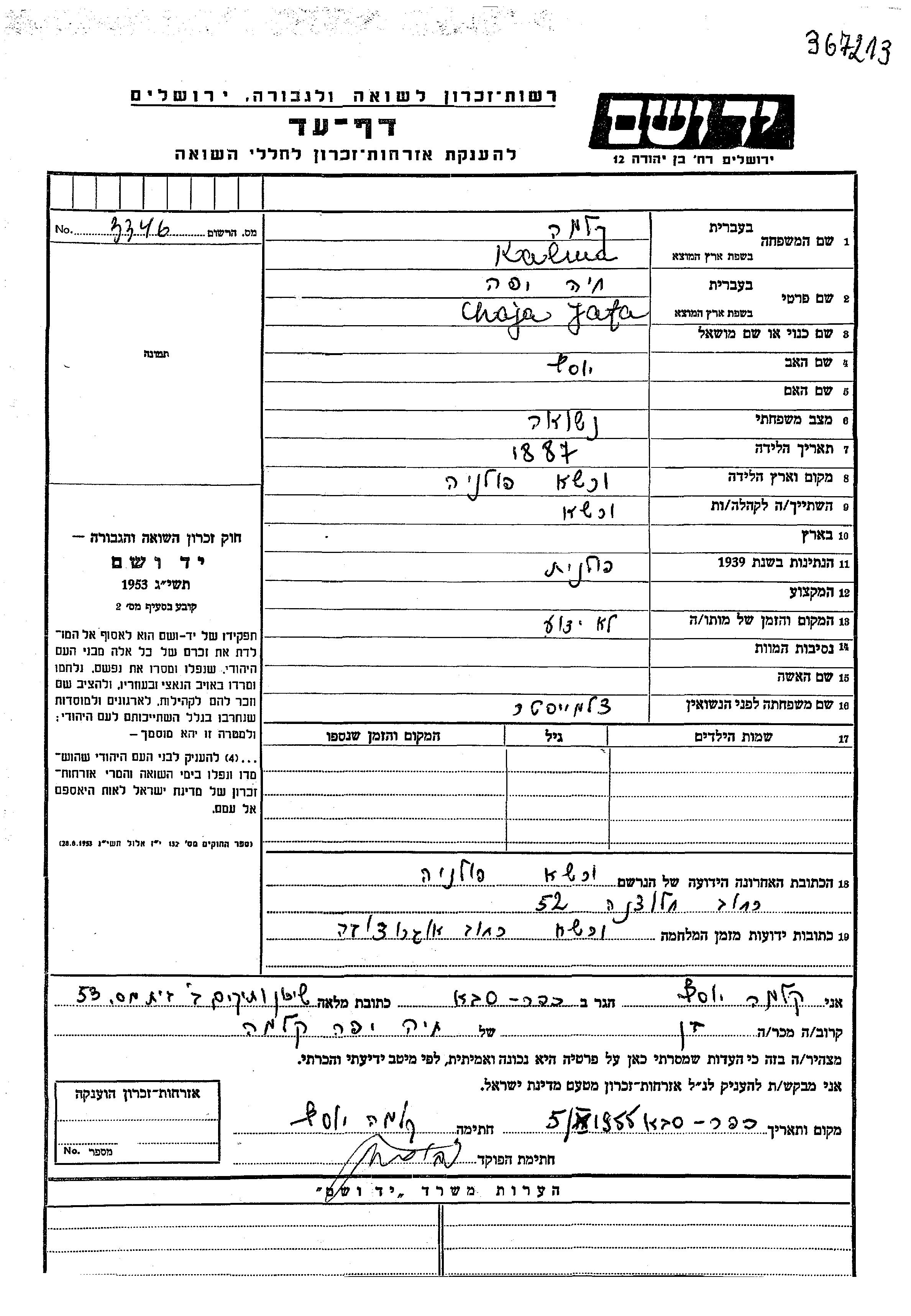 Kalma Chaja Yafa 1887 Warsaw, Poland Page of Testimony