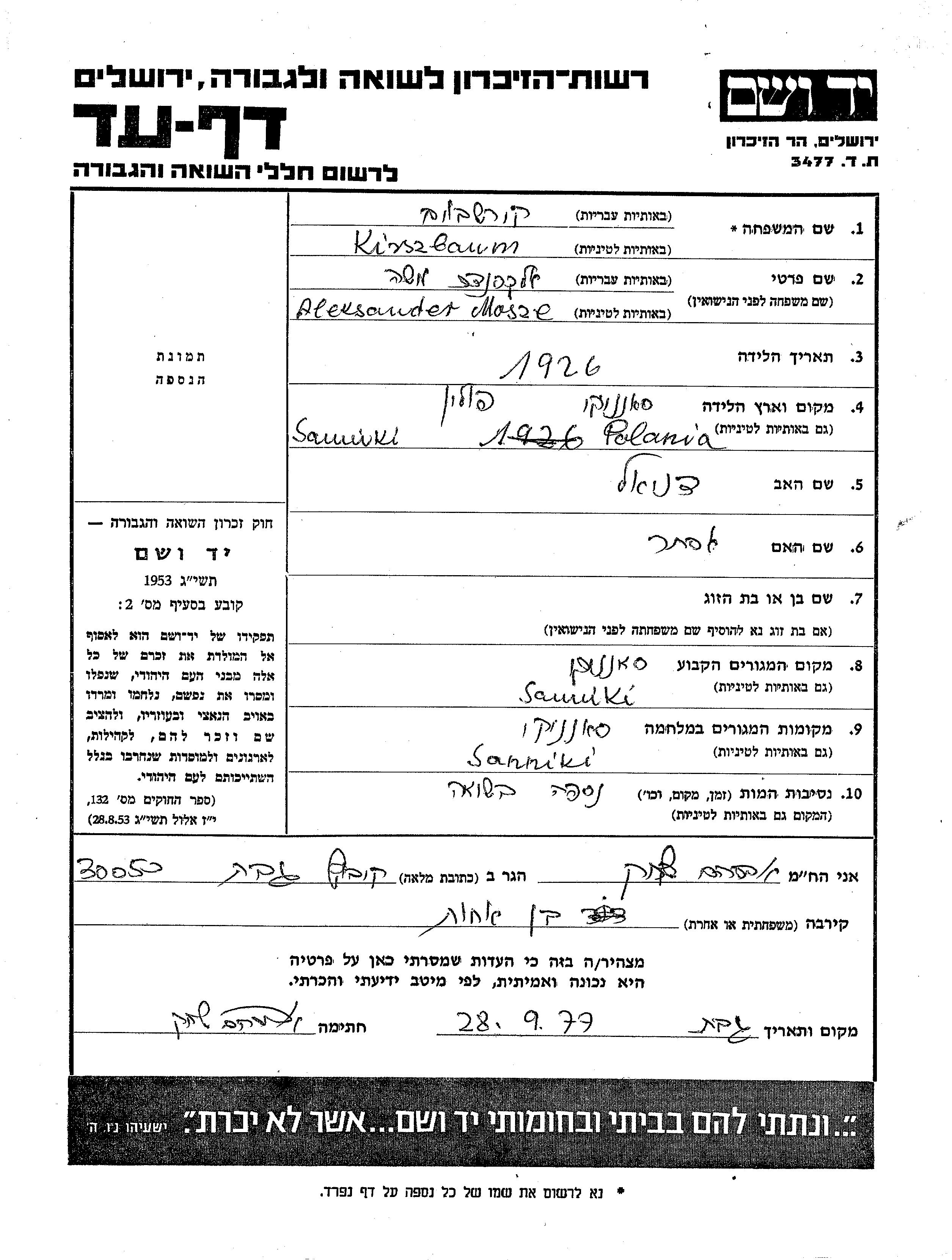 Mosze Aleksander Kirszbaum was born in Sanniki, Poland, 1926 to Daniel and Ester. Prior to WWII he lived in Sanniki, Poland. During the war he was in Sanniki, Poland. Mosze Aleksander was murdered in the Shoah.