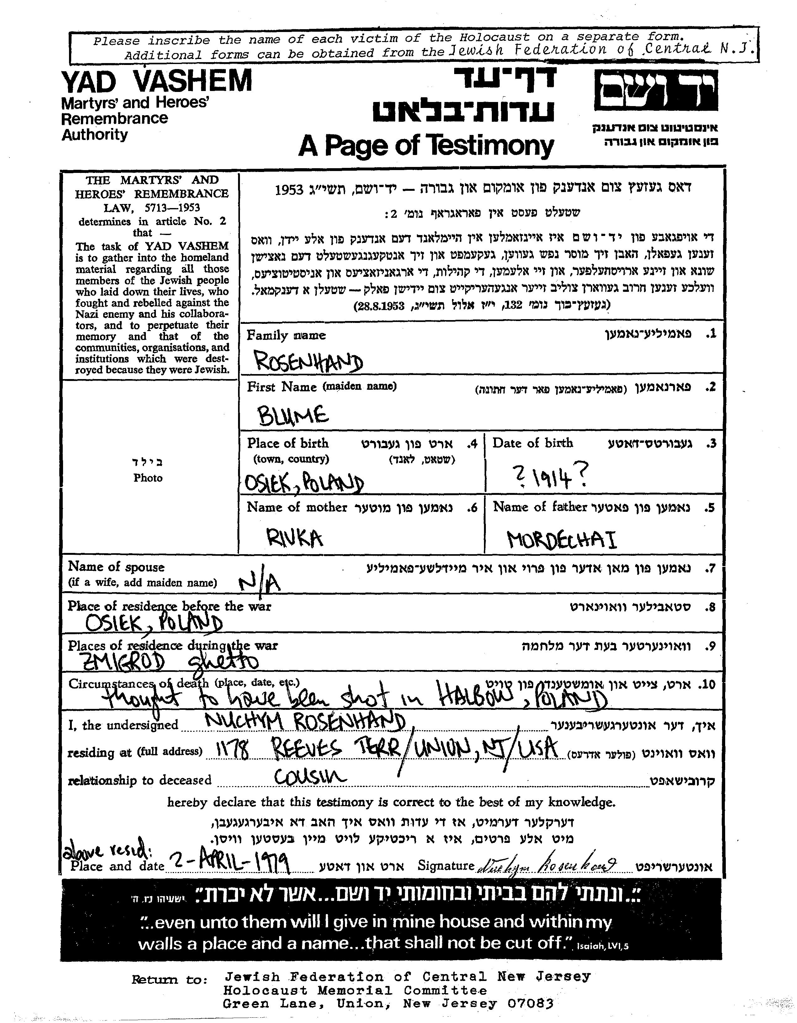 Bluma Rosenhand was born in Osiek, Poland, 1914 to Mordechai and Rivka. Prior to WWII she lived in Osiek, Poland. During the war she was in Zmigrod Nowy, Poland. Bluma was murdered in the Shoah. Place of death: Halbow, Poland.