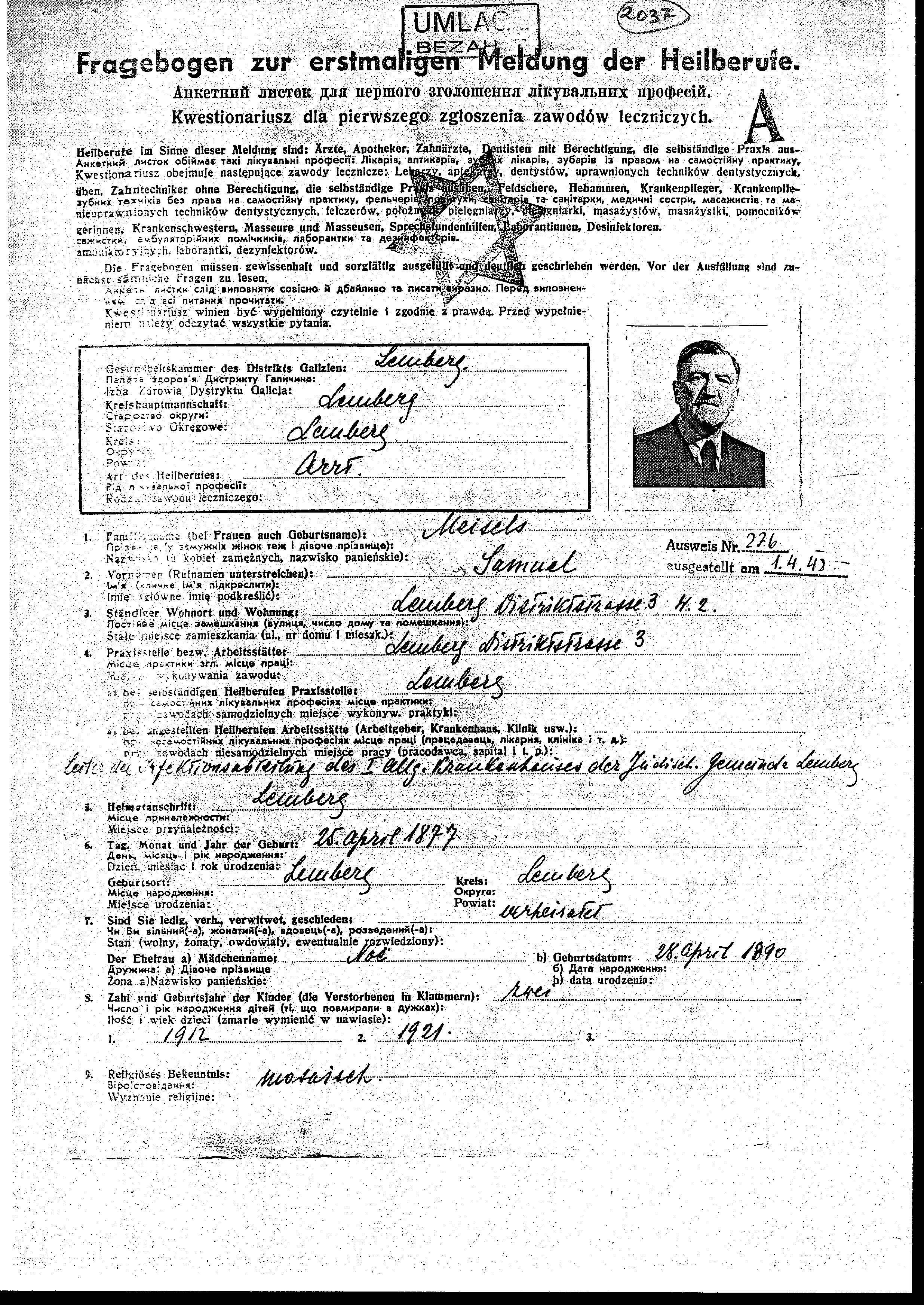Dr. Samuel Meisels was born in Lemberg, Poland, 1877. He was a physician and married. Prior to WWII he lived in Lemberg, Poland. During the war he was in Lemberg, Poland.