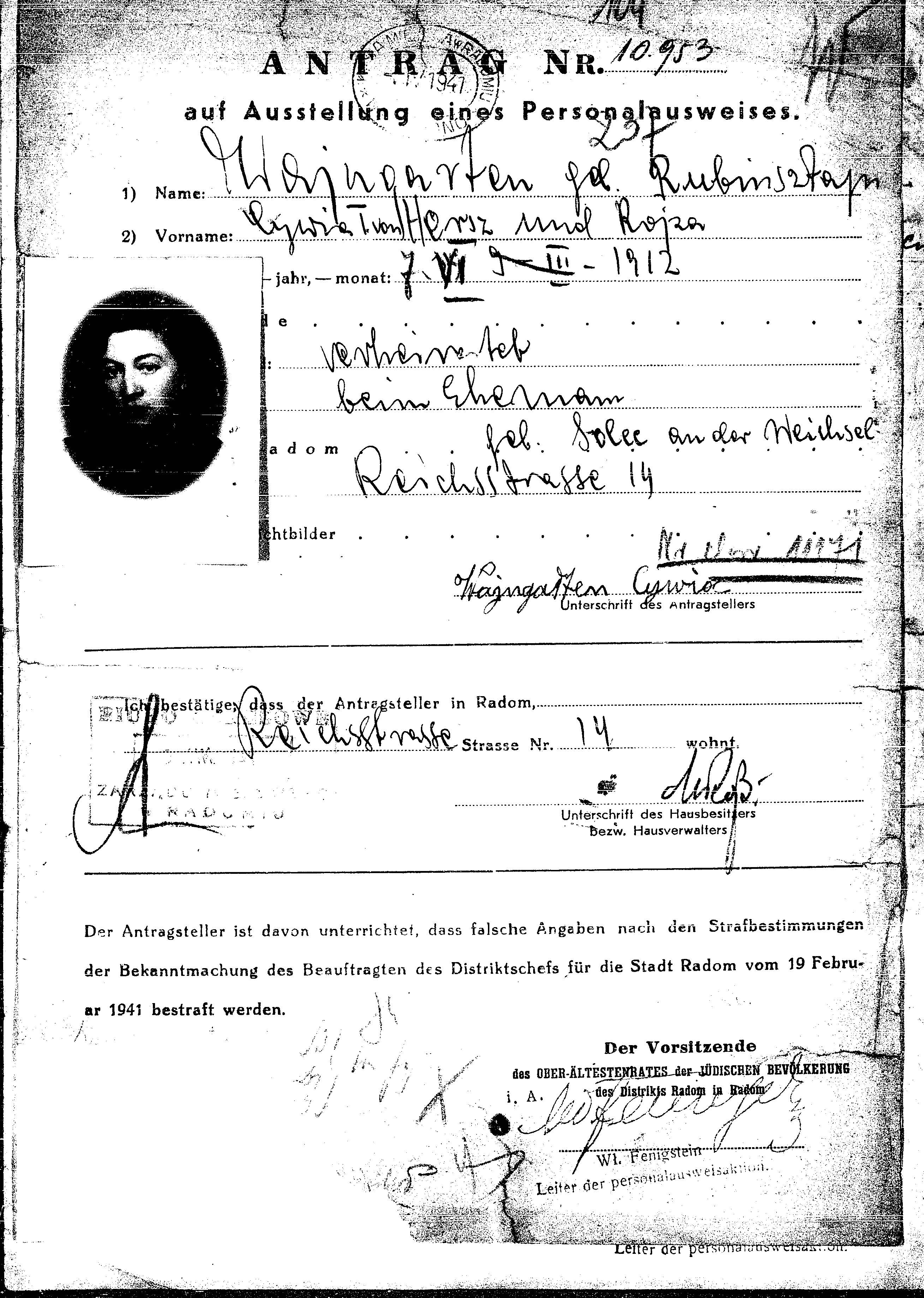 Cywia Wajngarten nee Rubinsztajn was born in Solec nad Wisla, Poland, 1912 to Hersz and Rojza. She was a handelsangestellter and married. Prior to WWII she lived in Radom, Poland. During the war she was in Radom, Poland. Cywia Probably murdered the Shoah.