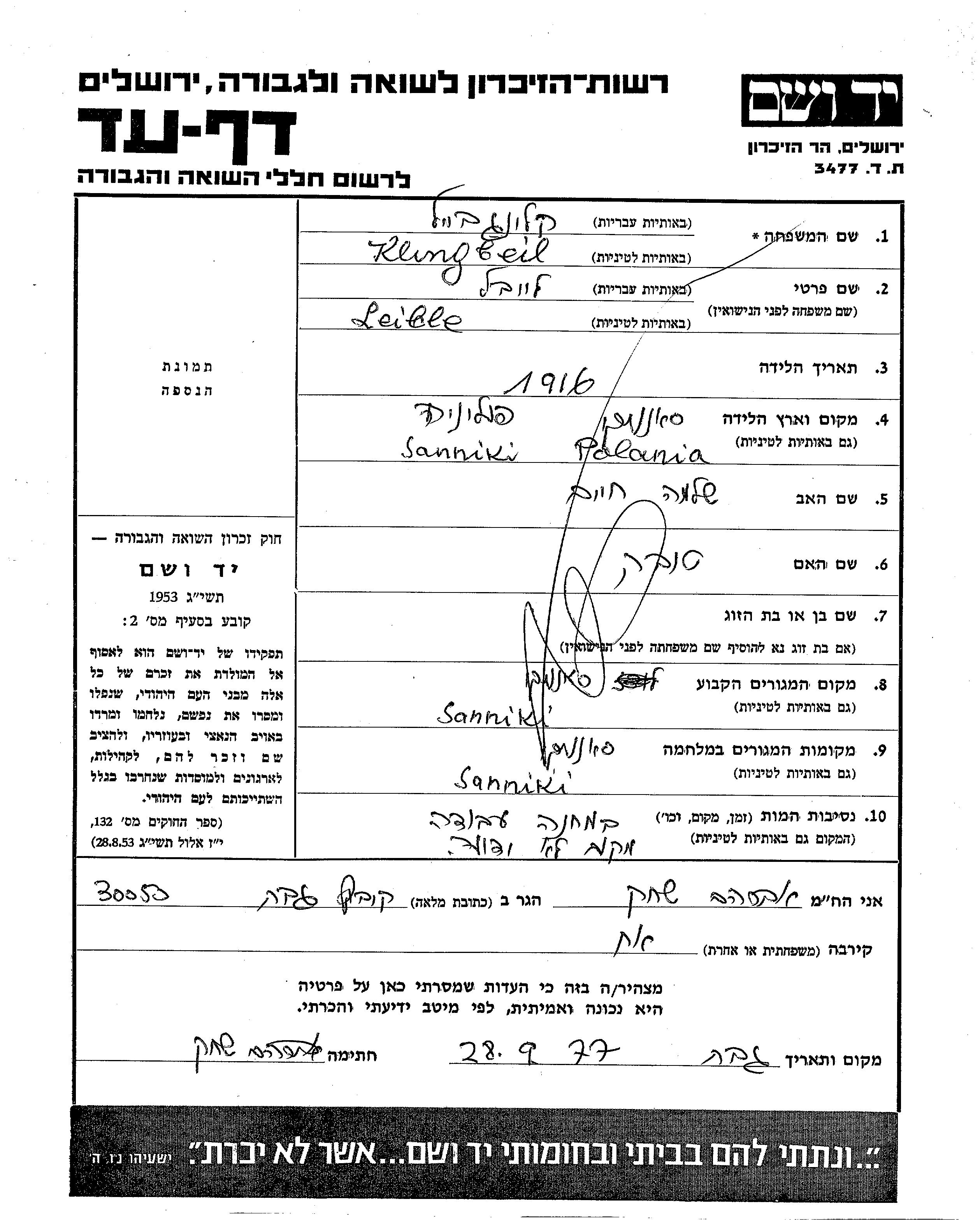 Leibal Klingbeil was born in Sanniki, Poland, 1916 to Shlomo Khaim and Tova. Prior to WWII he lived in Sanniki, Poland. During the war he was in Sanniki, Poland. Leibal was murdered in the Shoah.