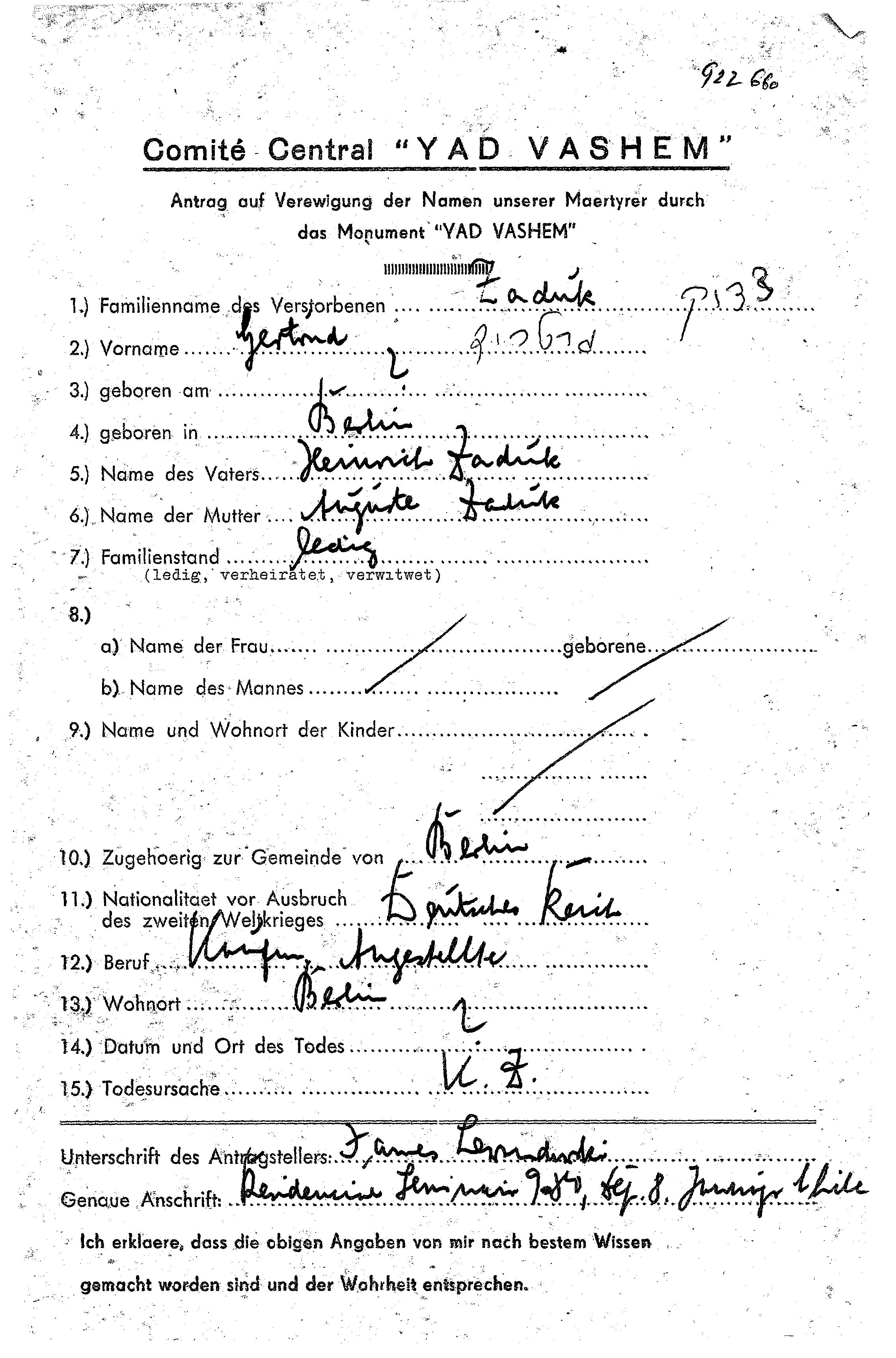 Zaduk Tzadok Gertrud Berlin, Germany Page of Testimony