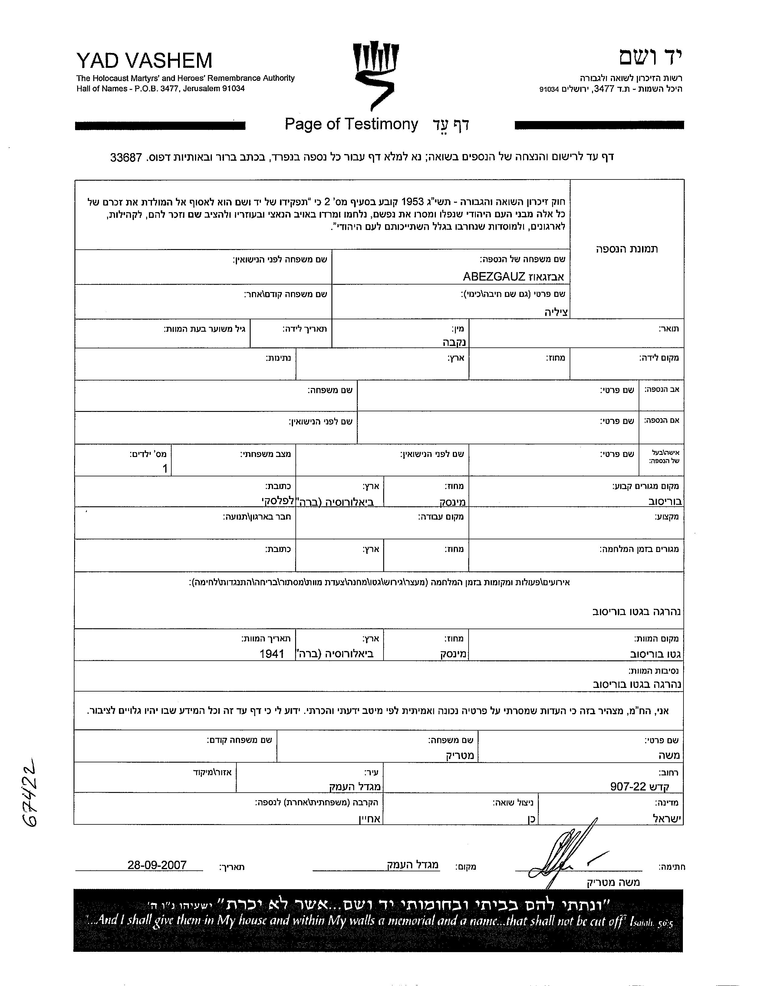 Abezgauz Tzilia Borisov, Belorussia (USSR) Page of Testimony (digital signed)