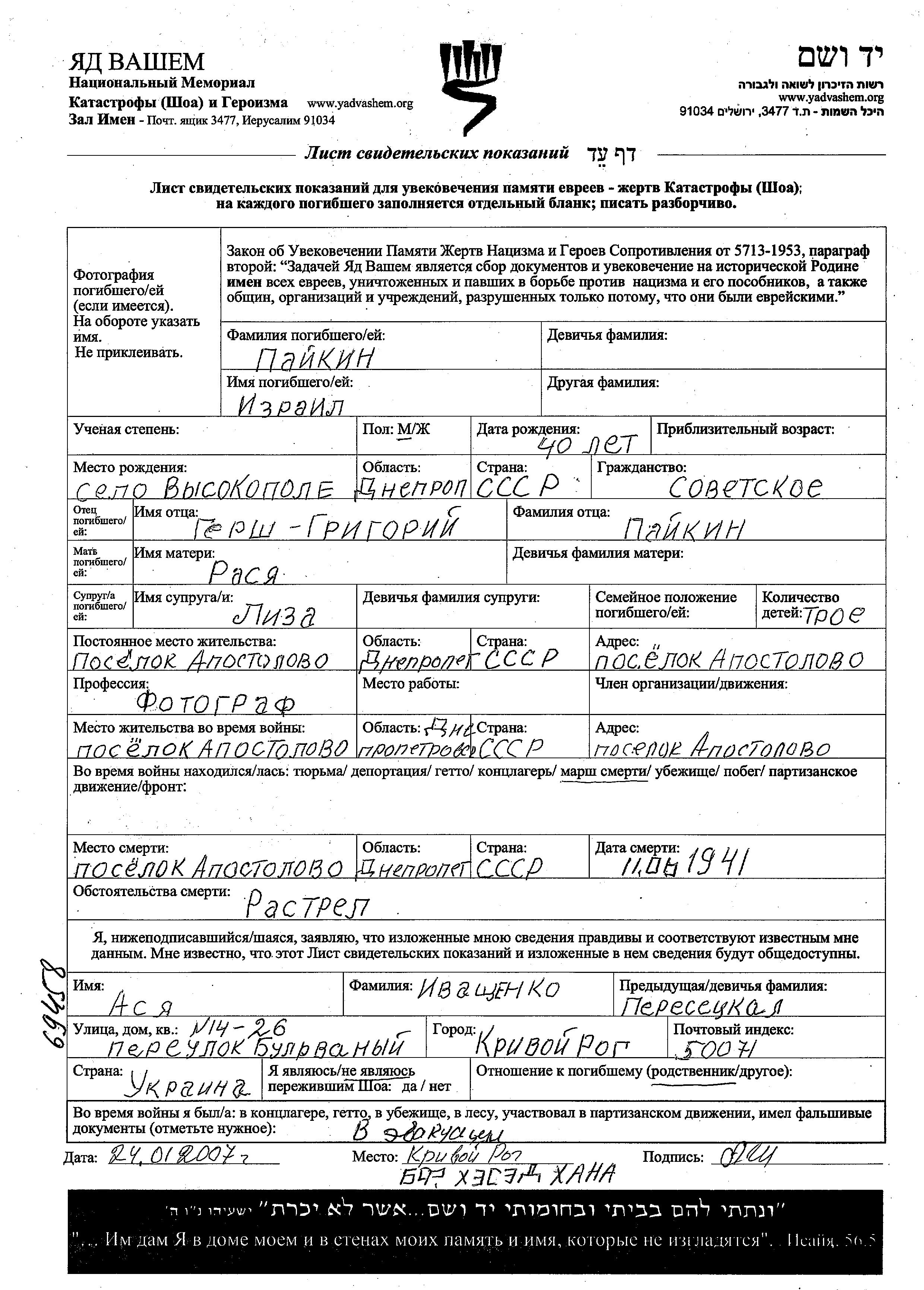 Izrail Paikin was born in Vysokopol, Ukraine (USSR) to Gersh Grigori and Rasya. He was a photographer and married to Liza. Prior to WWII he lived in Apostolovo, Ukraine (USSR). During the war he was in Apostolovo, Ukraine (USSR). Izrail was murdered in the Shoah. Place of death: Apostolovo, Ukraine (USSR), 11/06/1942.