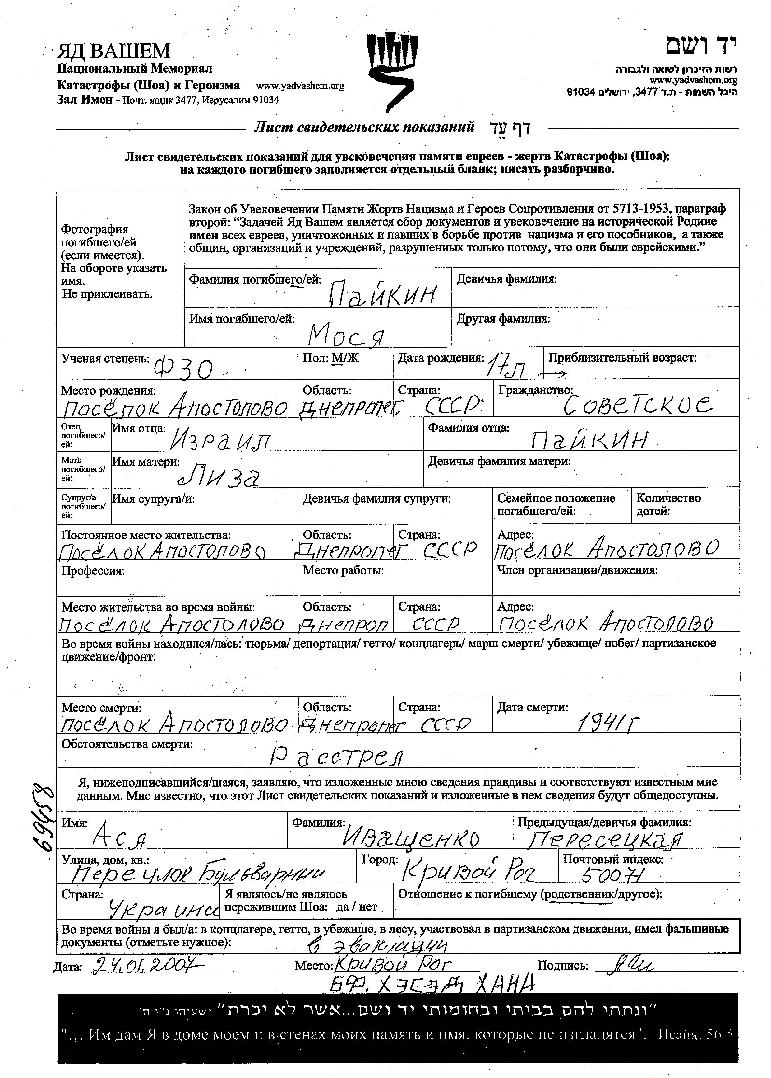 Mosya Paikin was born in Apostolovo, Ukraine (USSR) to Izrail and Liza. He was teenager. Prior to WWII he lived in Apostolovo, Ukraine (USSR). During the war he was in Apostolovo, Ukraine (USSR). Mosya was murdered in the Shoah. Place of death: Apostolovo, Ukraine (USSR), 1941.